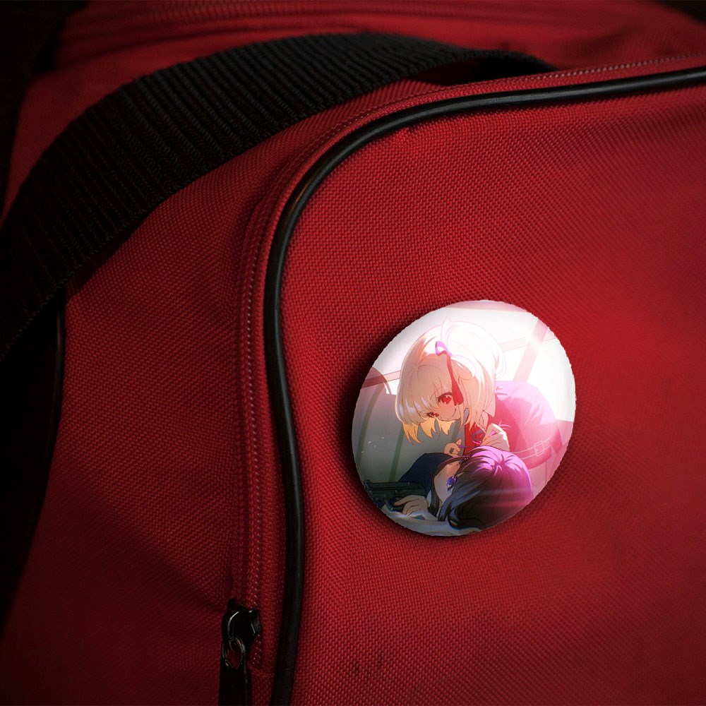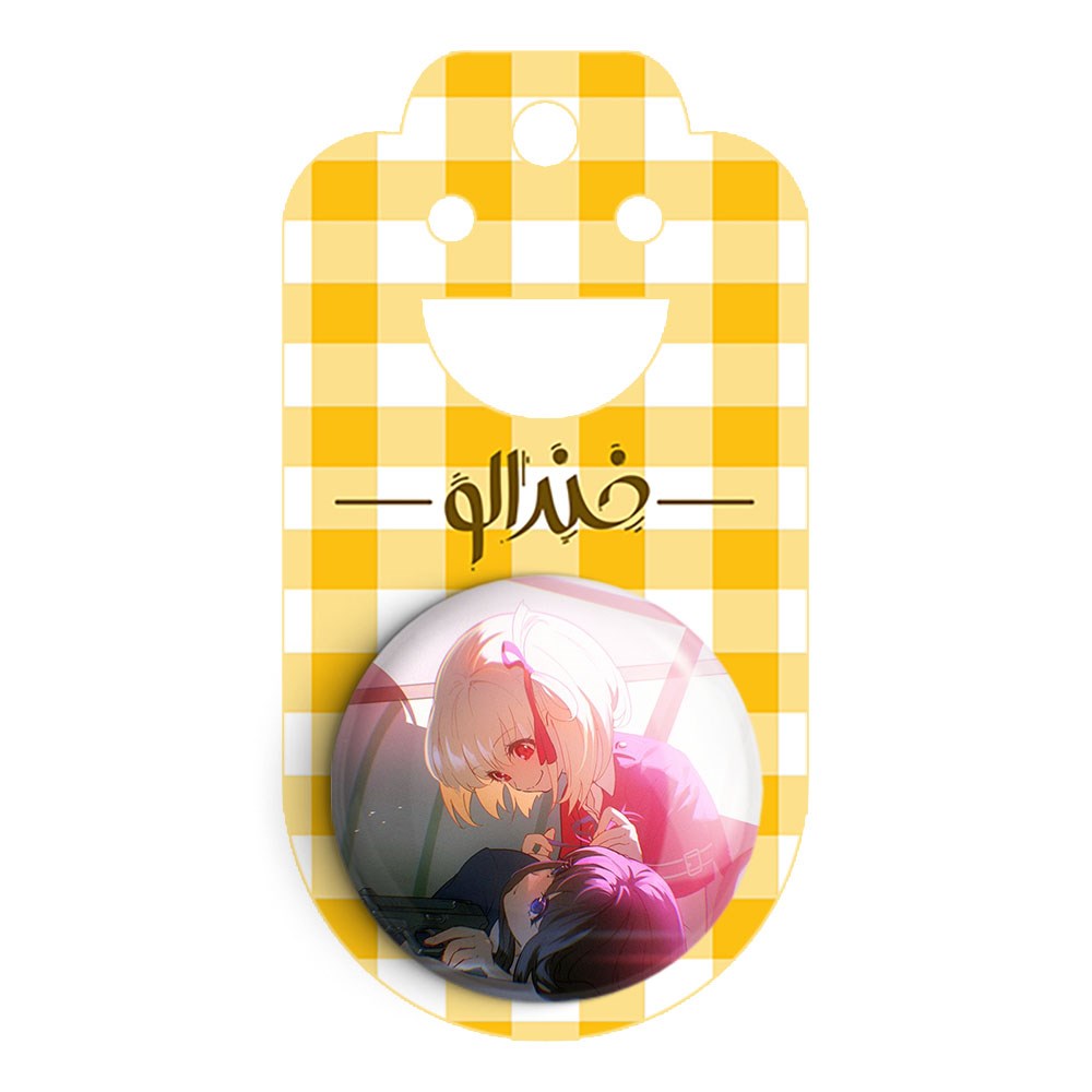 پیکسل 44 میلی متری تاکینا و چیساتو انیمه لیکوریس ریکویل Lycoris Recoil خندالو با روکش سلفون حرارتی مات مخملی ضدخش و قطعه پشتی رنگی تولید شده است.پلاستیکی پشت پیکسل با سوزن یک تکه ثابت و بدون لغزش و جا به جایی، ایستایی بسیار بهتری نسبت به پشتی فلزی پیکسل دارند که این مهم در تولید این محصول نیز رعایت شده است.