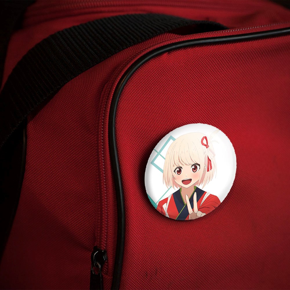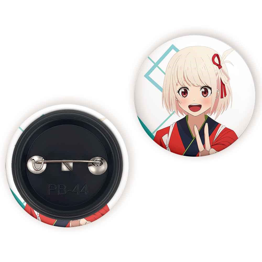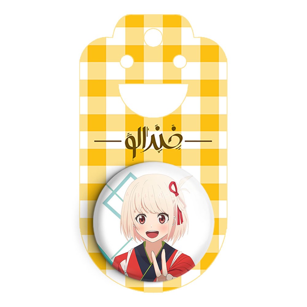 پیکسل 44 میلی متری تاکینا و چیساتو انیمه لیکوریس ریکویل Lycoris Recoil خندالو با روکش سلفون حرارتی مات مخملی ضدخش و قطعه پشتی رنگی تولید شده است.پلاستیکی پشت پیکسل با سوزن یک تکه ثابت و بدون لغزش و جا به جایی، ایستایی بسیار بهتری نسبت به پشتی فلزی پیکسل دارند که این مهم در تولید این محصول نیز رعایت شده است.