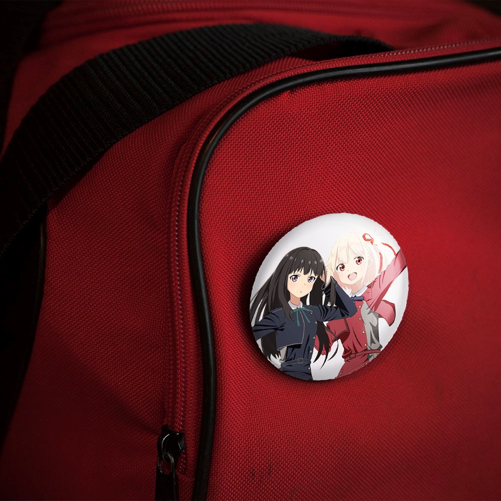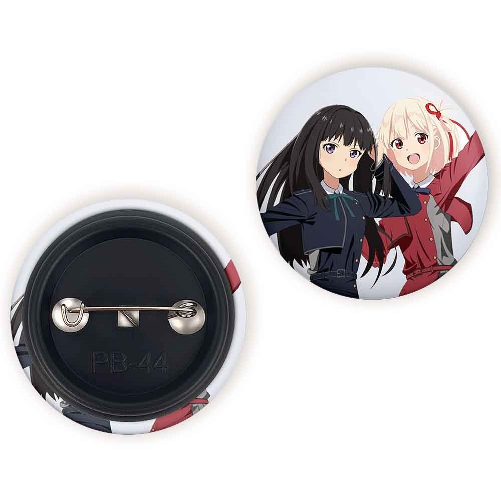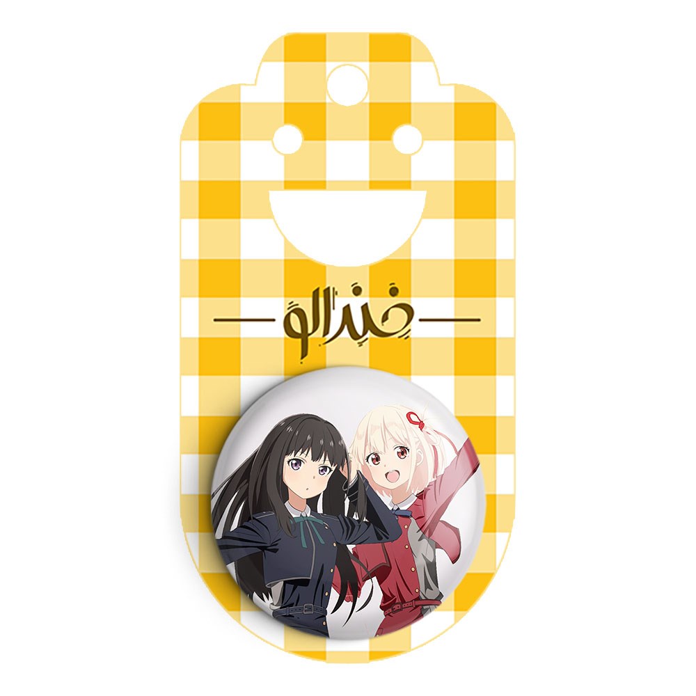 پیکسل 44 میلی متری تاکینا و چیساتو انیمه لیکوریس ریکویل Lycoris Recoil خندالو با روکش سلفون حرارتی مات مخملی ضدخش و قطعه پشتی رنگی تولید شده است.پلاستیکی پشت پیکسل با سوزن یک تکه ثابت و بدون لغزش و جا به جایی، ایستایی بسیار بهتری نسبت به پشتی فلزی پیکسل دارند که این مهم در تولید این محصول نیز رعایت شده است.
