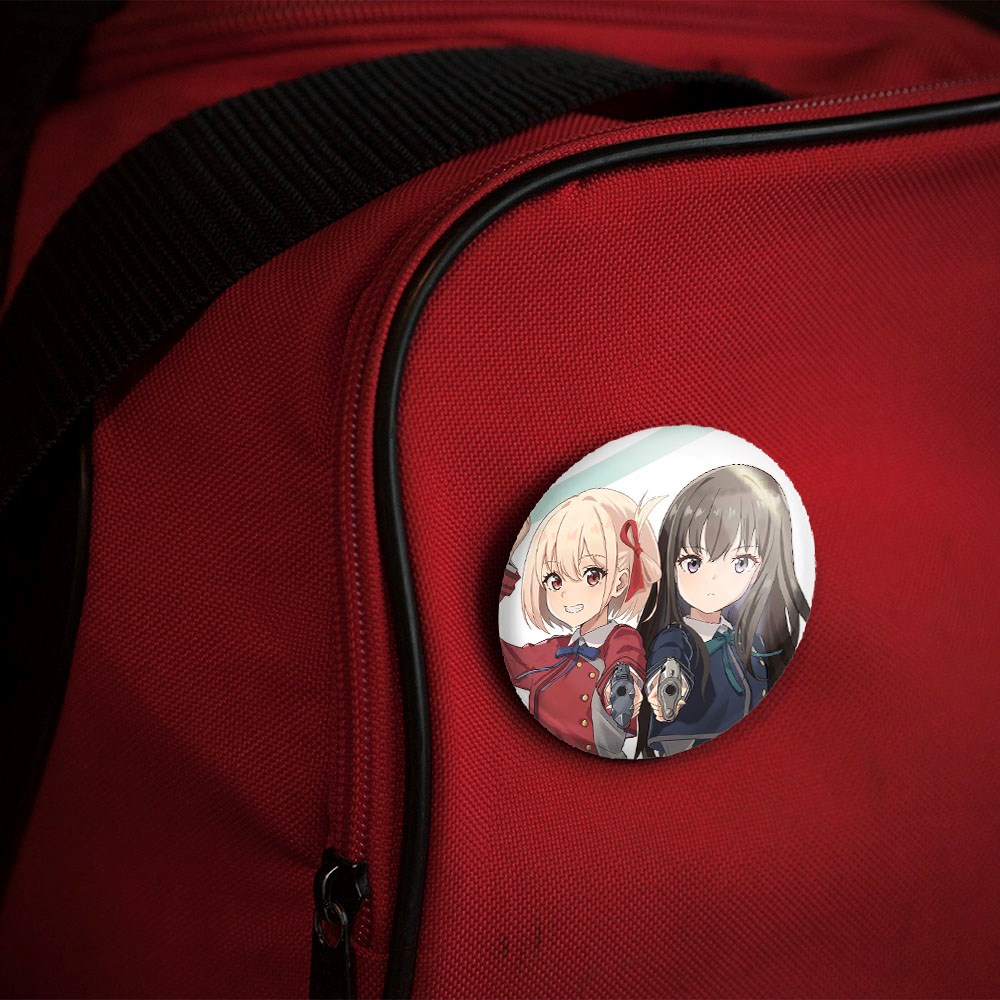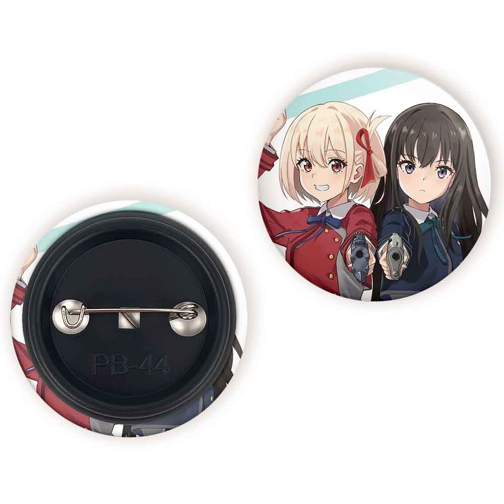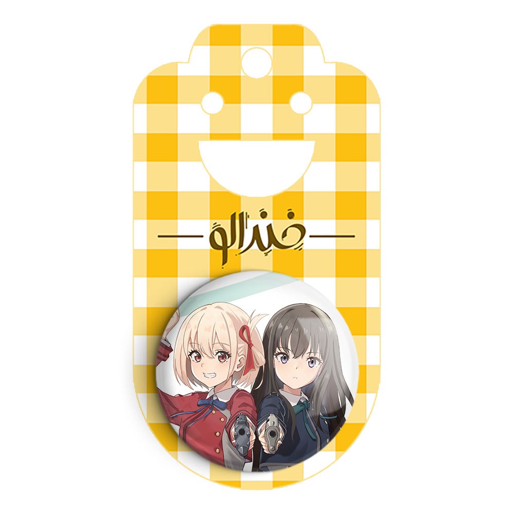 پیکسل 44 میلی متری تاکینا و چیساتو انیمه لیکوریس ریکویل Lycoris Recoil خندالو با روکش سلفون حرارتی مات مخملی ضدخش و قطعه پشتی رنگی تولید شده است.پلاستیکی پشت پیکسل با سوزن یک تکه ثابت و بدون لغزش و جا به جایی، ایستایی بسیار بهتری نسبت به پشتی فلزی پیکسل دارند که این مهم در تولید این محصول نیز رعایت شده است.