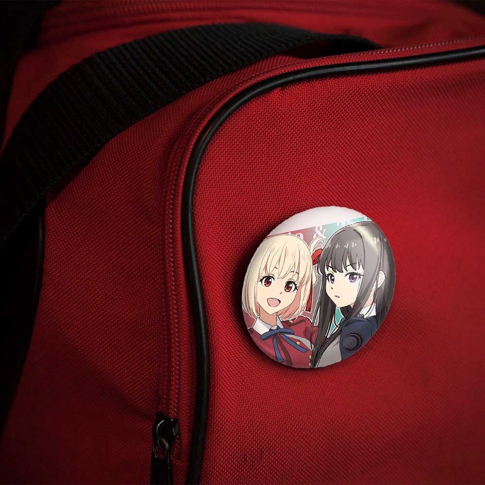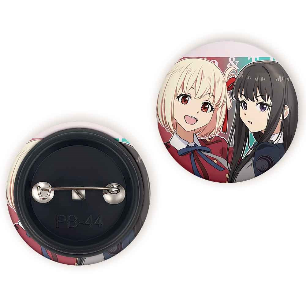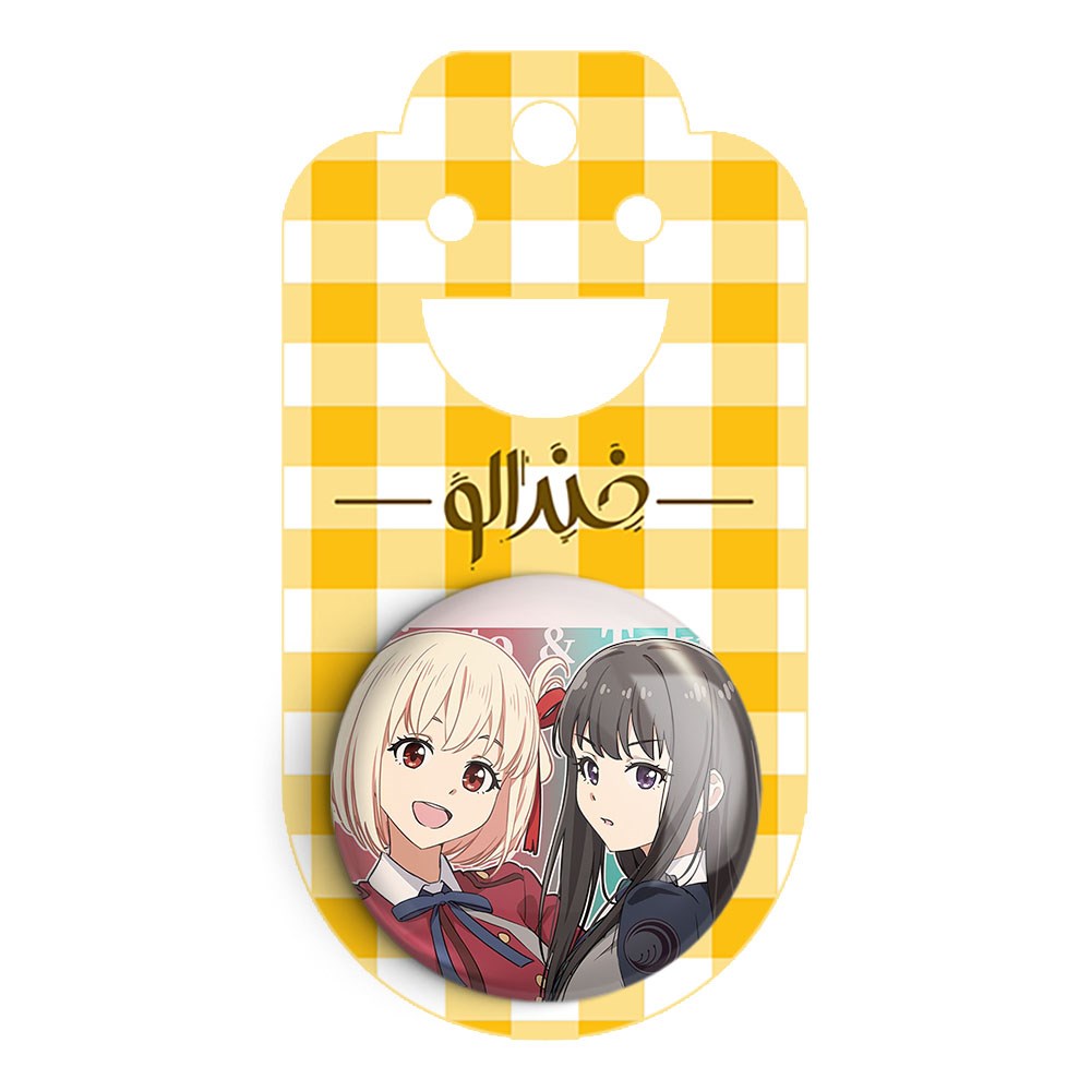 پیکسل 44 میلی متری تاکینا و چیساتو انیمه لیکوریس ریکویل Lycoris Recoil خندالو با روکش سلفون حرارتی مات مخملی ضدخش و قطعه پشتی رنگی تولید شده است.پلاستیکی پشت پیکسل با سوزن یک تکه ثابت و بدون لغزش و جا به جایی، ایستایی بسیار بهتری نسبت به پشتی فلزی پیکسل دارند که این مهم در تولید این محصول نیز رعایت شده است.