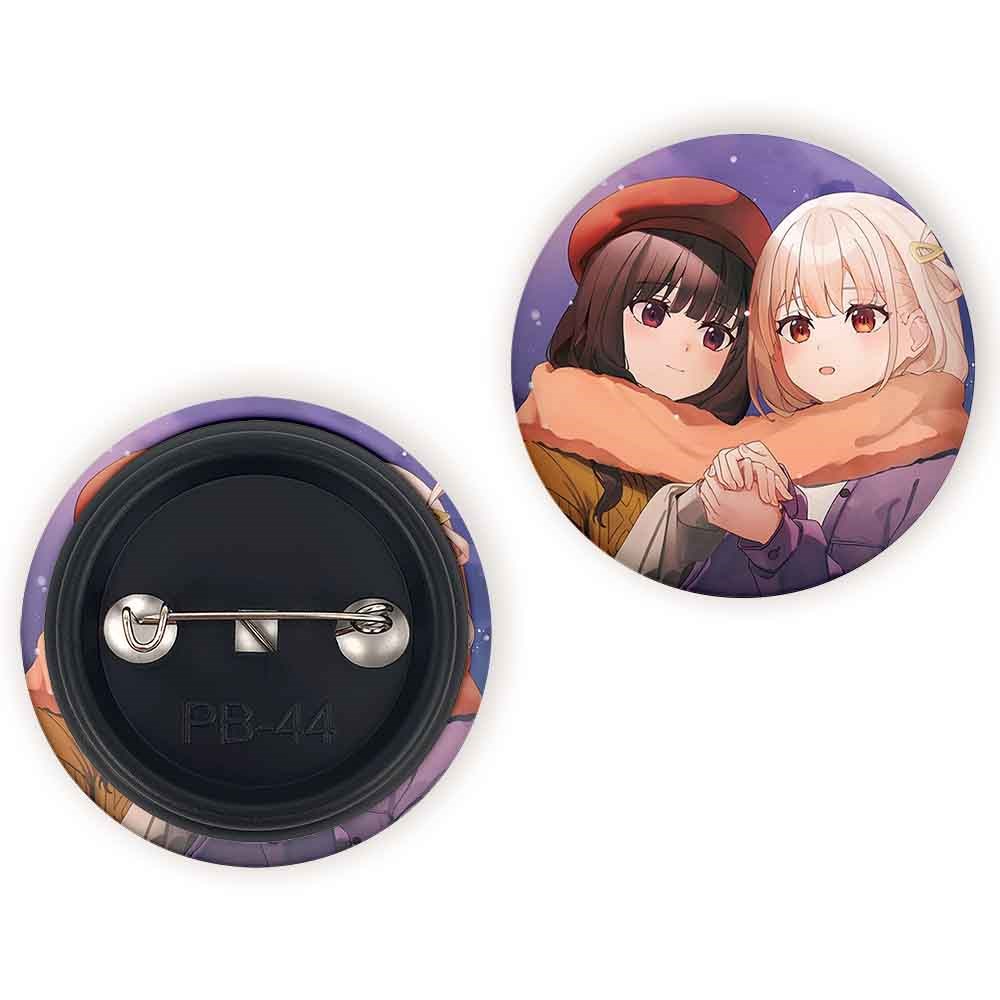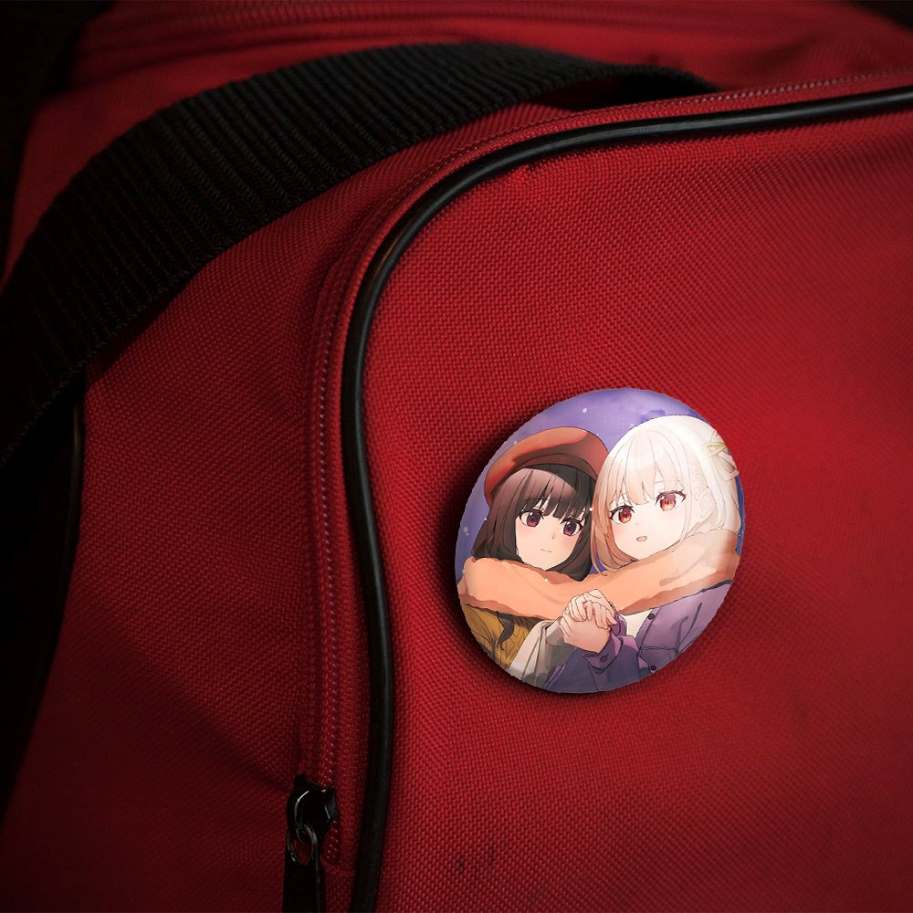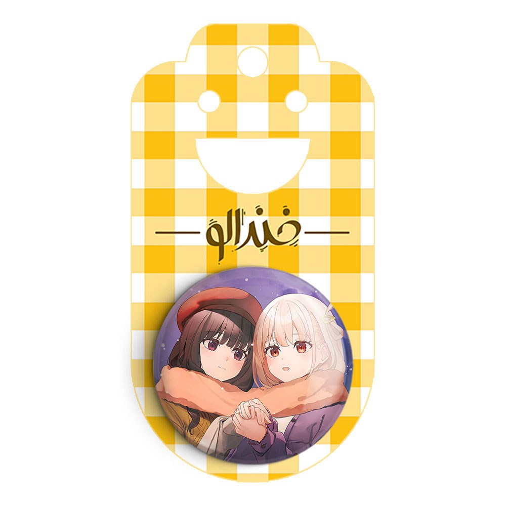 پیکسل 44 میلی متری تاکینا و چیساتو انیمه لیکوریس ریکویل Lycoris Recoil خندالو با روکش سلفون حرارتی مات مخملی ضدخش و قطعه پشتی رنگی تولید شده است.پلاستیکی پشت پیکسل با سوزن یک تکه ثابت و بدون لغزش و جا به جایی، ایستایی بسیار بهتری نسبت به پشتی فلزی پیکسل دارند که این مهم در تولید این محصول نیز رعایت شده است.
