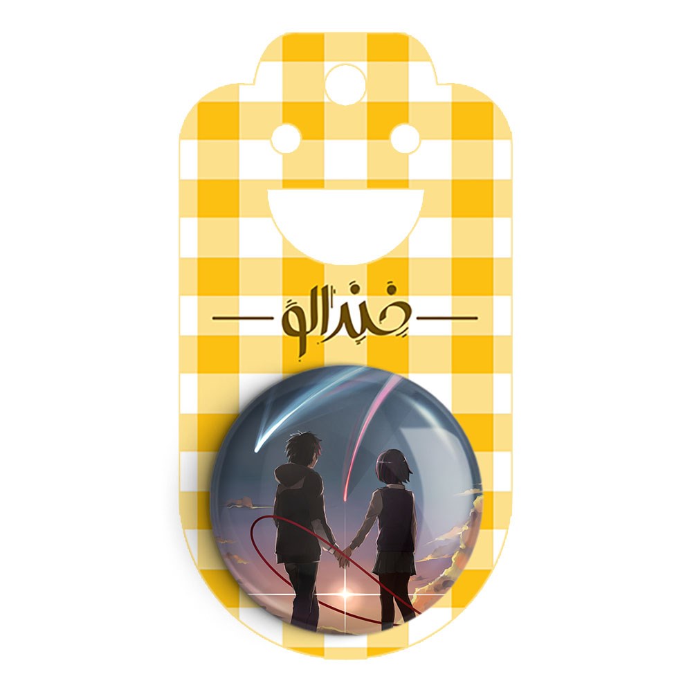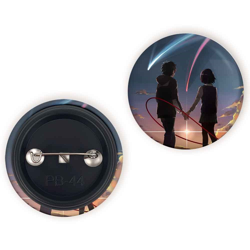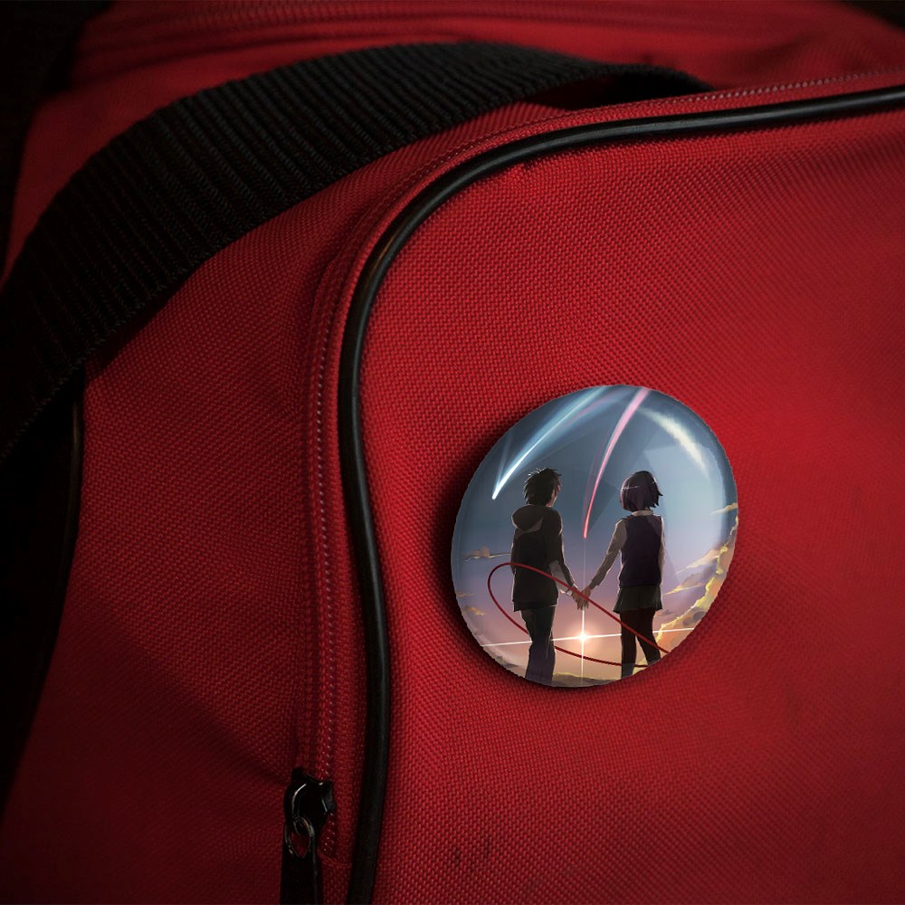 پیکسل 44 میلی متری تاکی تاچیبانا و میتسویا میامیزو انیمه یورنیم Your Name خندالو با روکش سلفون حرارتی مات مخملی ضدخش و قطعه پشتی رنگی تولید شده است.پلاستیکی پشت پیکسل با سوزن یک تکه ثابت و بدون لغزش و جا به جایی، ایستایی بسیار بهتری نسبت به پشتی فلزی پیکسل دارند که این مهم در تولید این محصول نیز رعایت شده است.