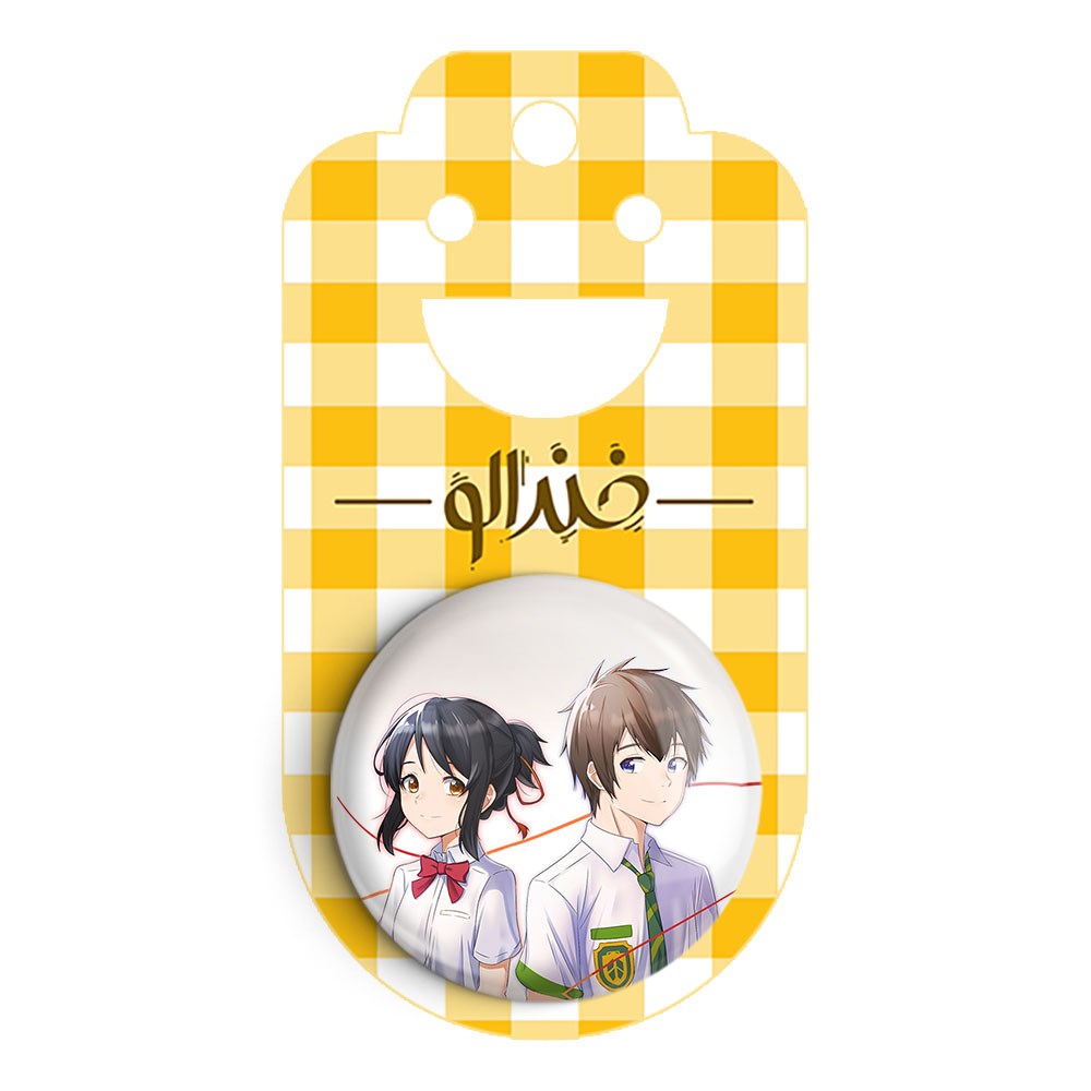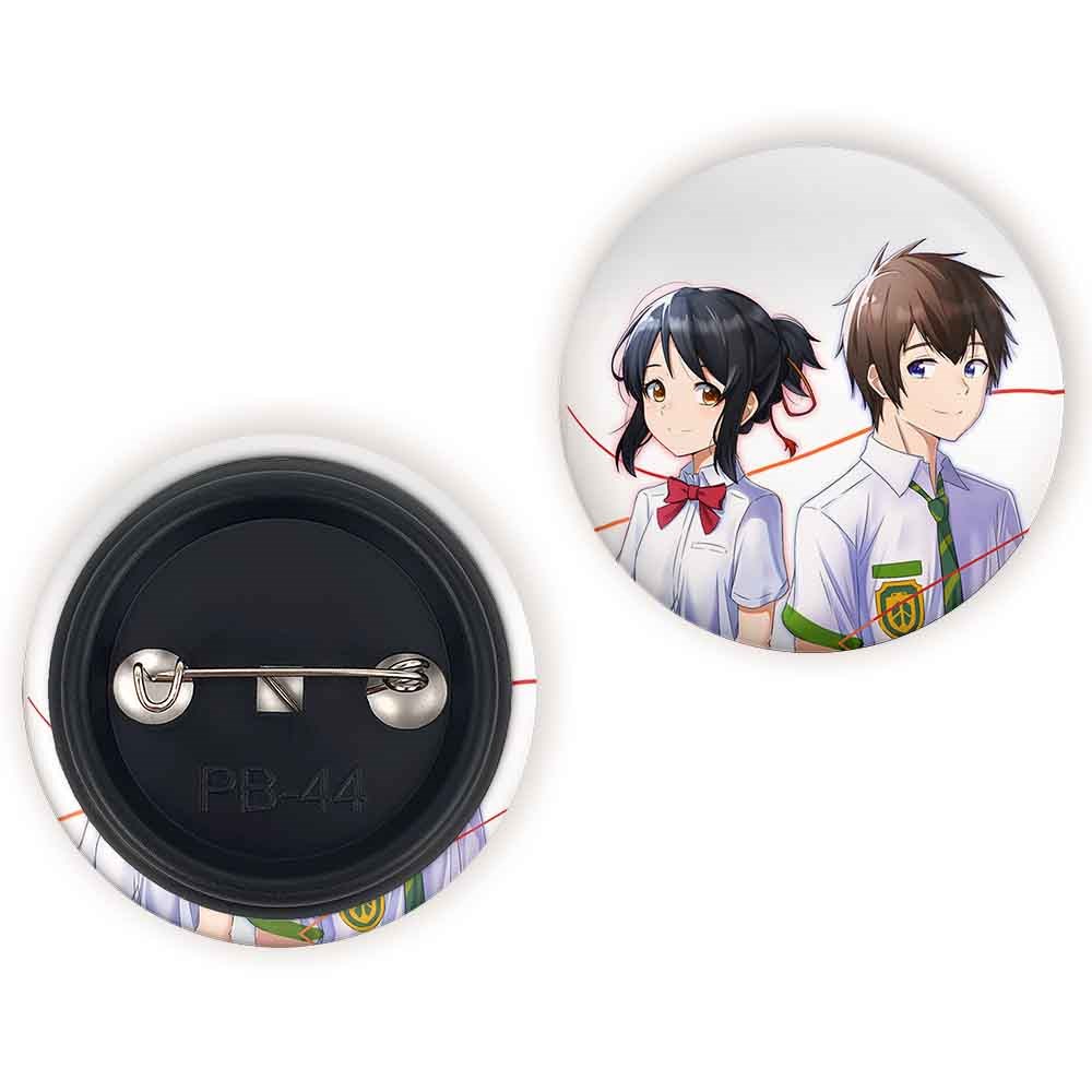 پیکسل 44 میلی متری تاکی تاچیبانا و میتسویا میامیزو انیمه یورنیم Your Name خندالو با روکش سلفون حرارتی مات مخملی ضدخش و قطعه پشتی رنگی تولید شده است.پلاستیکی پشت پیکسل با سوزن یک تکه ثابت و بدون لغزش و جا به جایی، ایستایی بسیار بهتری نسبت به پشتی فلزی پیکسل دارند که این مهم در تولید این محصول نیز رعایت شده است.