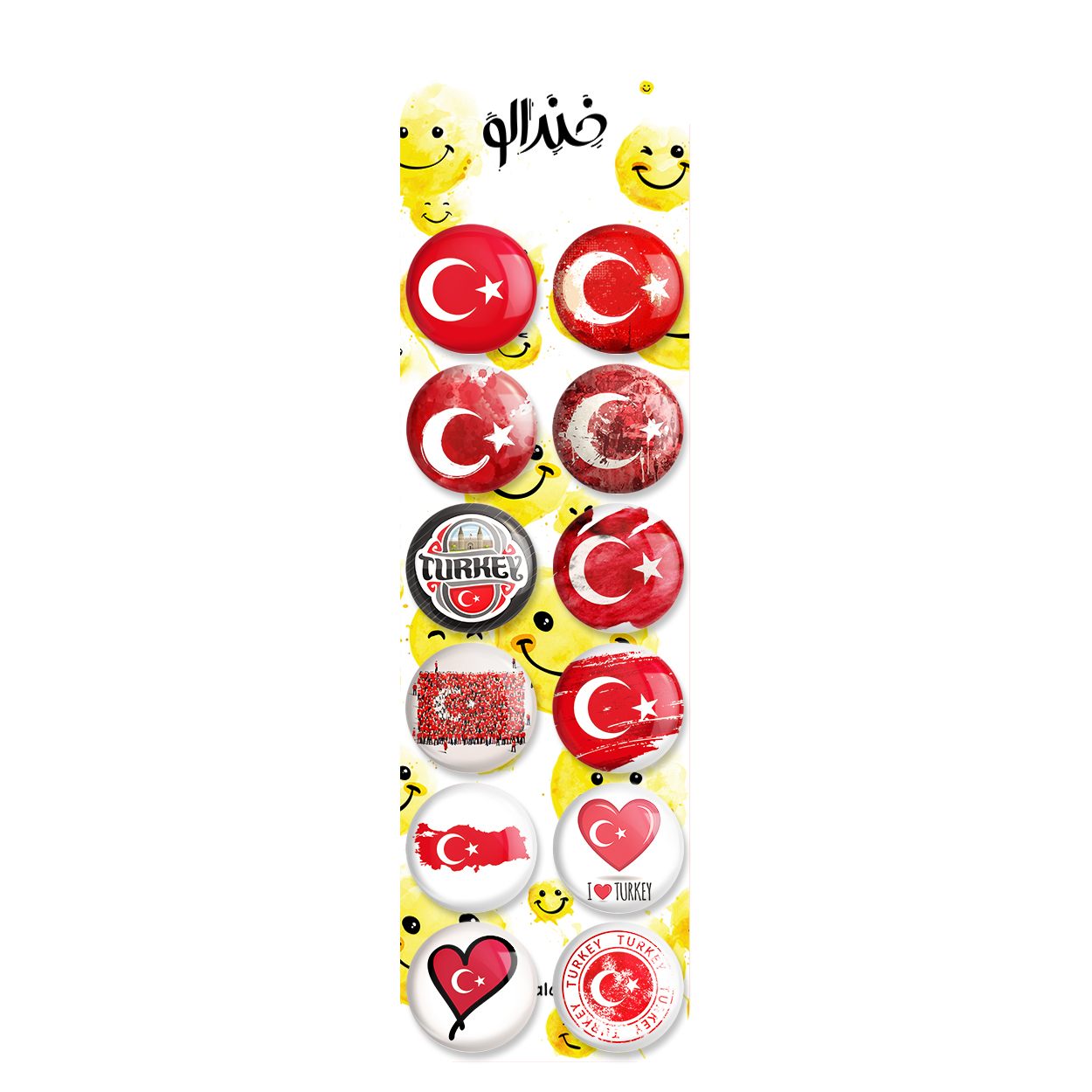 پک 12 عددی پیکسل خندالو طرح ترکیه (Turkey) با روکش سلفون حرارتی براق ضدخش و قطعه پشتی رنگی تولید شده است. قطعات پشتی از میان 6 رنگ سفید، مشکی، صورتی، زرد، آبی و قرمز که با توجه به نوع و رنگبندی طرح روی پیکسل انتخاب شده اند تولید می شود و در هر بسته بندی مطابق عکس محصول می باشد. قطعات پلاستیکی پشت پیکسل با سوزن یک تکه ثابت و بدون لغزش و جا به جایی، ایستایی بسیار بهتری نسبت به پشتی فلزی پیکسل دارند که این مهم در تولید این محصول نیز رعایت شده است. چاپ پیکسل طرح ترکیه (Turkey) بسته ۱۲ عددی نیز با دستگاه های استاندارد و با بهترین سطح کیفی صورت گرفته و طرح با شفافیتی مثال زدنی و با سلفونی بدون شکست نور بر روی پیکسل نقش بسته است.