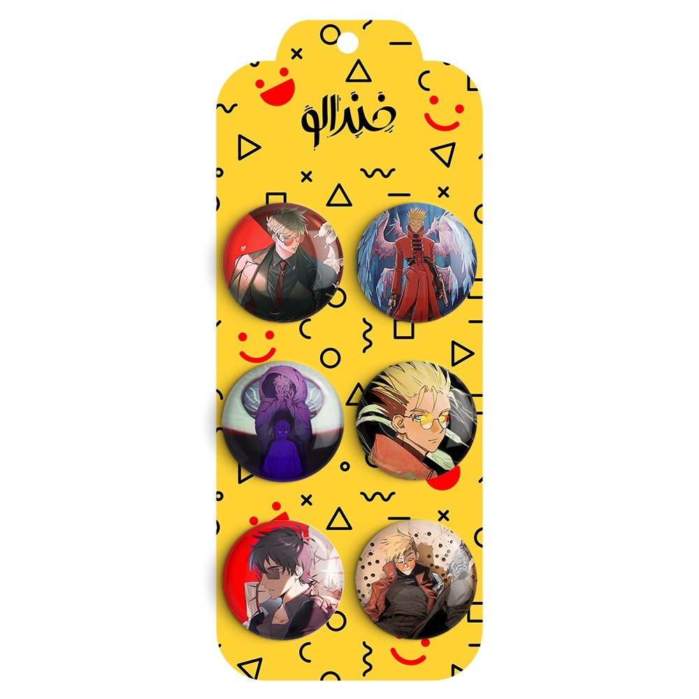 مجموعه 6 عددی پیکسل خندالو طرح تریگان (Trigun) با روکش سلفون حرارتی براق ضدخش و قطعه پشتی رنگی تولید شده است. قطعات پشتی از میان 6 رنگ سفید، مشکی، صورتی، زرد، آبی و قرمز که با توجه به نوع و رنگبندی طرح روی پیکسل انتخاب شده اند تولید می شود و در هر بسته بندی مطابق عکس محصول می باشد.