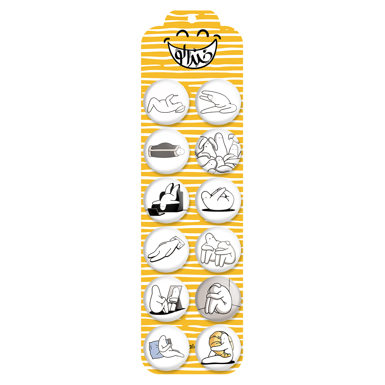 پک 12 عددی پیکسل خندالو طرح تنبل خسته با روکش سلفون حرارتی براق ضدخش و قطعه پشتی رنگی تولید شده است. قطعات پشتی از میان 6 رنگ سفید، مشکی، صورتی، زرد، آبی و قرمز که با توجه به نوع و رنگبندی طرح روی پیکسل انتخاب شده اند تولید می شود و در هر بسته بندی مطابق عکس محصول می باشد. قطعات پلاستیکی پشت پیکسل با سوزن یک تکه ثابت و بدون لغزش و جا به جایی، ایستایی بسیار بهتری نسبت به پشتی فلزی پیکسل دارند که این مهم در تولید این محصول نیز رعایت شده است. چاپ پیکسل طرح تنبل خسته بسته ۱۲ عددی نیز با دستگاه های استاندارد و با بهترین سطح کیفی صورت گرفته و طرح با شفافیتی مثال زدنی و با سلفونی بدون شکست نور بر روی پیکسل نقش بسته است.