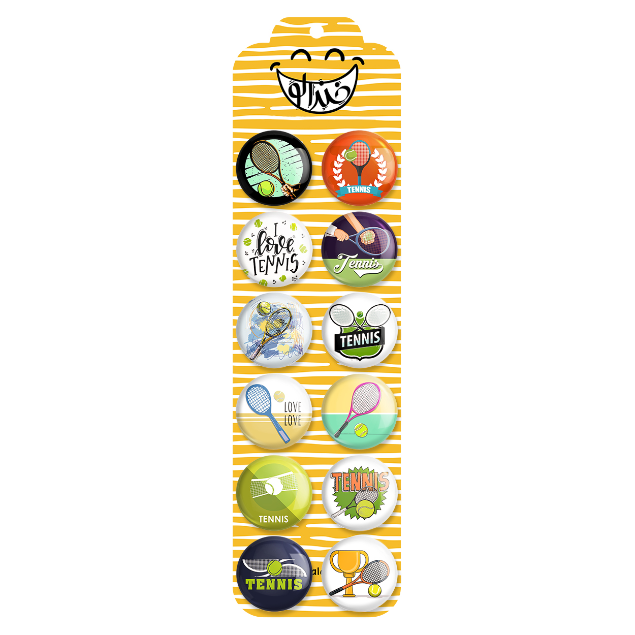 پک 12 عددی پیکسل خندالو طرح تنیس (Tennis) با روکش سلفون حرارتی براق ضدخش و قطعه پشتی رنگی تولید شده است. قطعات پشتی از میان 6 رنگ سفید، مشکی، صورتی، زرد، آبی و قرمز که با توجه به نوع و رنگبندی طرح روی پیکسل انتخاب شده اند تولید می شود و در هر بسته بندی مطابق عکس محصول می باشد. قطعات پلاستیکی پشت پیکسل با سوزن یک تکه ثابت و بدون لغزش و جا به جایی، ایستایی بسیار بهتری نسبت به پشتی فلزی پیکسل دارند که این مهم در تولید این محصول نیز رعایت شده است.