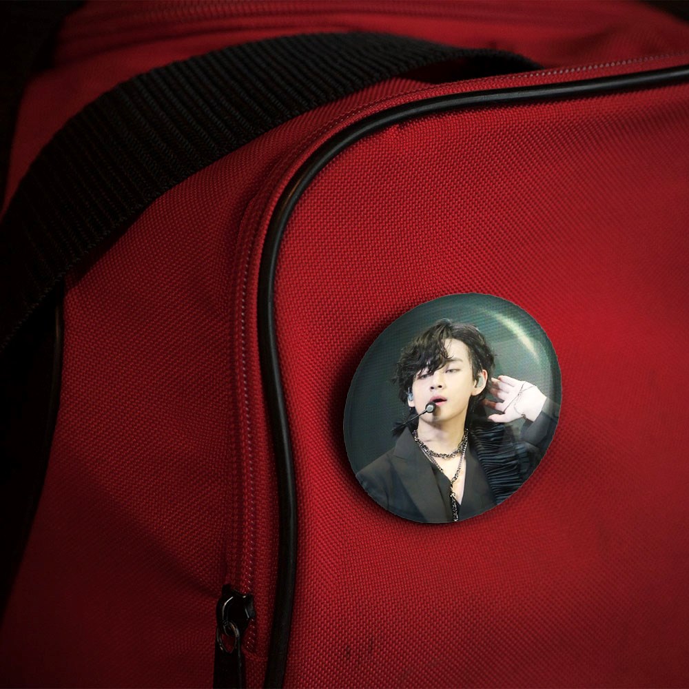 پیکسل 44 میلی متری تهیونگ وی Taehyung گروه بی تی اس BTS خندالو با روکش سلفون حرارتی مات مخملی ضدخش و قطعه پشتی رنگی تولید شده است.پلاستیکی پشت پیکسل با سوزن یک تکه ثابت و بدون لغزش و جا به جایی، ایستایی بسیار بهتری نسبت به پشتی فلزی پیکسل دارند که این مهم در تولید این محصول نیز رعایت شده است.