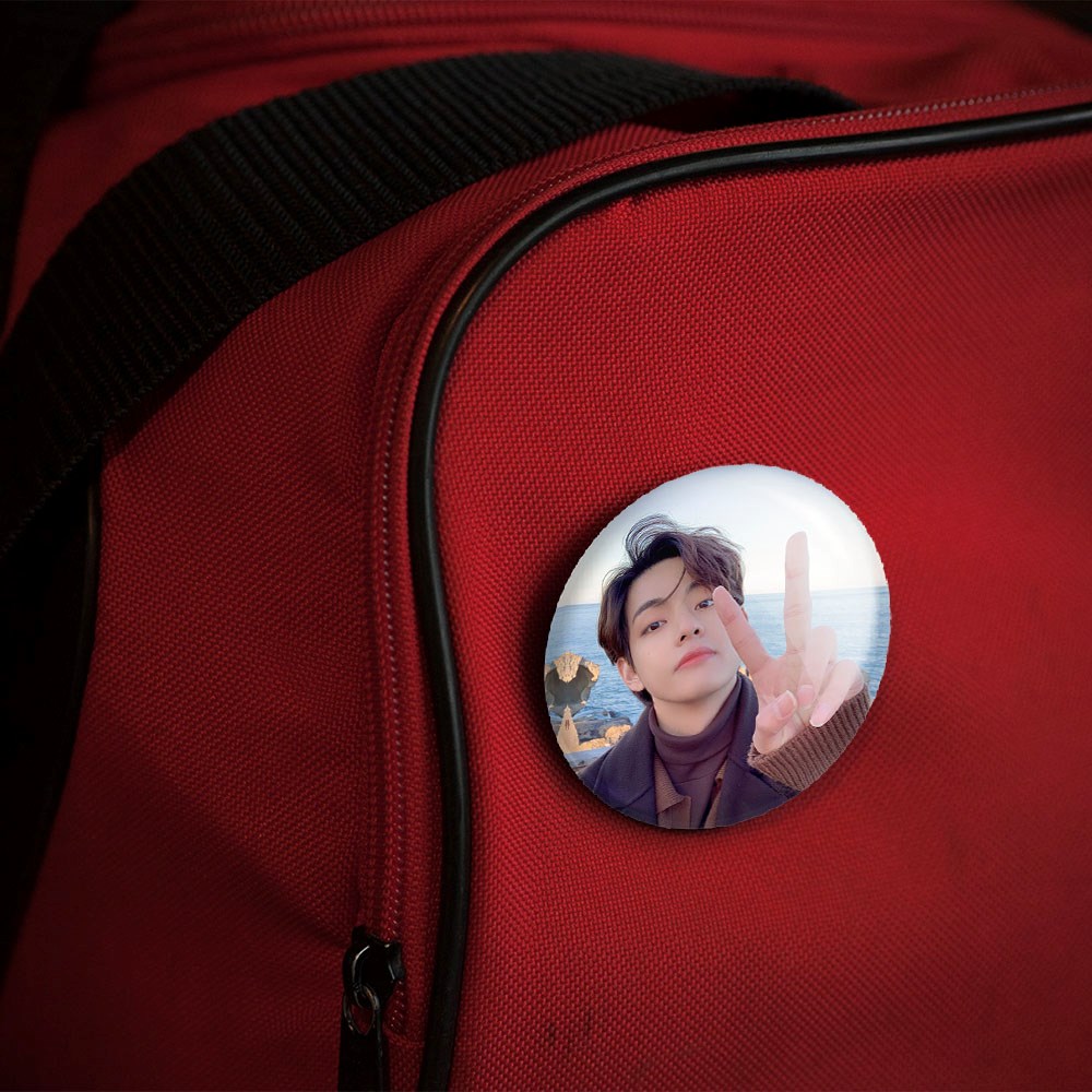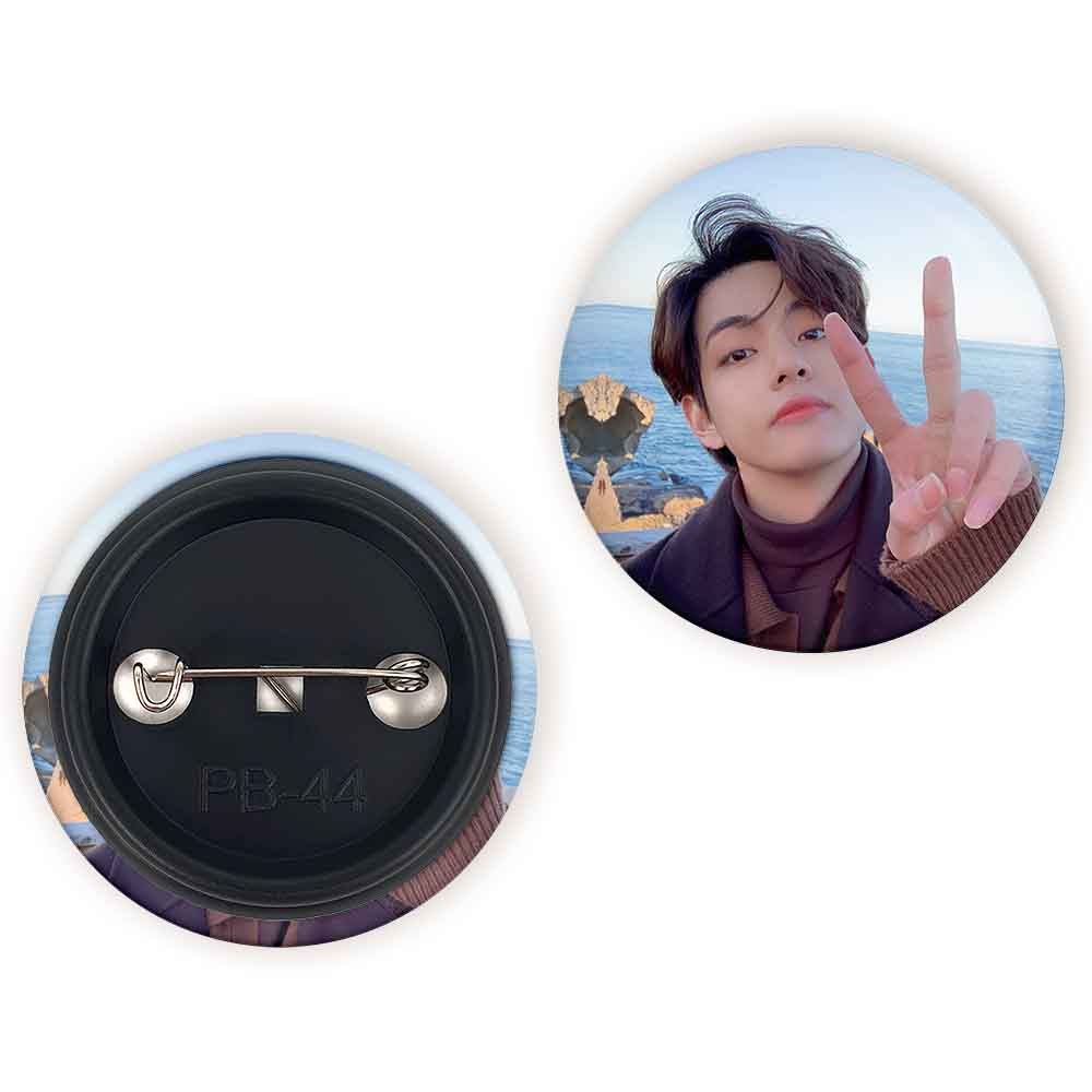 پیکسل 44 میلی متری تهیونگ وی Taehyung گروه بی تی اس BTS خندالو با روکش سلفون حرارتی مات مخملی ضدخش و قطعه پشتی رنگی تولید شده است.پلاستیکی پشت پیکسل با سوزن یک تکه ثابت و بدون لغزش و جا به جایی، ایستایی بسیار بهتری نسبت به پشتی فلزی پیکسل دارند که این مهم در تولید این محصول نیز رعایت شده است.
