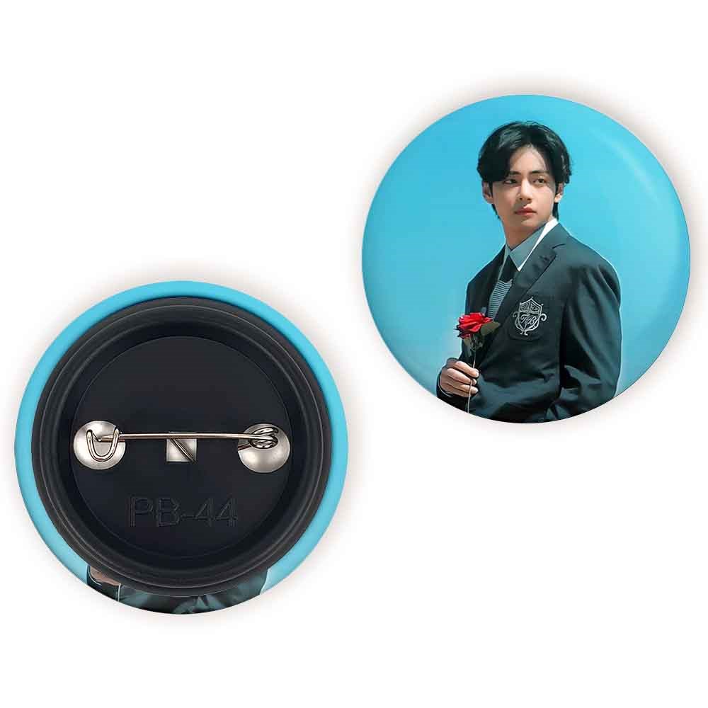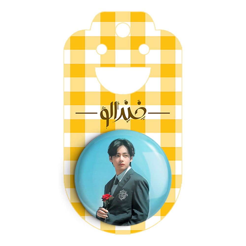 پیکسل 44 میلی متری تهیونگ وی Taehyung گروه بی تی اس BTS خندالو با روکش سلفون حرارتی مات مخملی ضدخش و قطعه پشتی رنگی تولید شده است.پلاستیکی پشت پیکسل با سوزن یک تکه ثابت و بدون لغزش و جا به جایی، ایستایی بسیار بهتری نسبت به پشتی فلزی پیکسل دارند که این مهم در تولید این محصول نیز رعایت شده است.