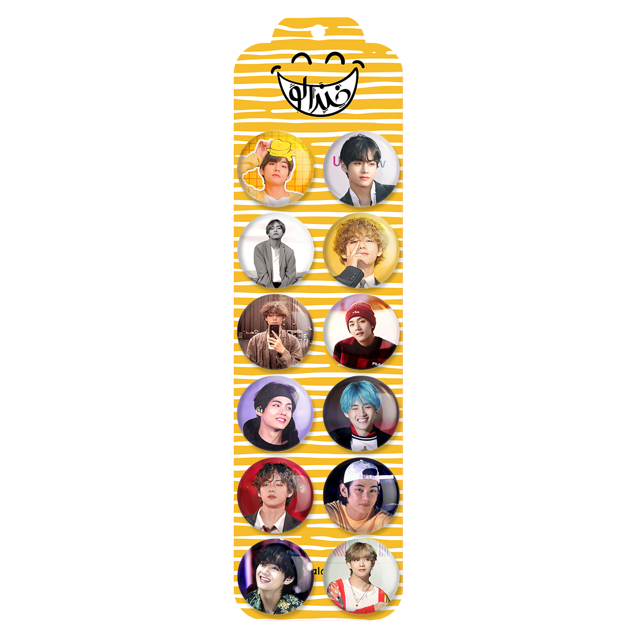 پک 12 عددی پیکسل خندالو طرح تهیونگ وی (Teahyung) بی تی اس BTS با روکش سلفون حرارتی براق ضدخش و قطعه پشتی رنگی تولید شده است. قطعات پشتی از میان 6 رنگ سفید، مشکی، صورتی، زرد، آبی و قرمز که با توجه به نوع و رنگبندی طرح روی پیکسل انتخاب شده اند تولید می شود و در هر بسته بندی مطابق عکس محصول می باشد. قطعات پلاستیکی پشت پیکسل با سوزن یک تکه ثابت و بدون لغزش و جا به جایی، ایستایی بسیار بهتری نسبت به پشتی فلزی پیکسل دارند که این مهم در تولید این محصول نیز رعایت شده است.