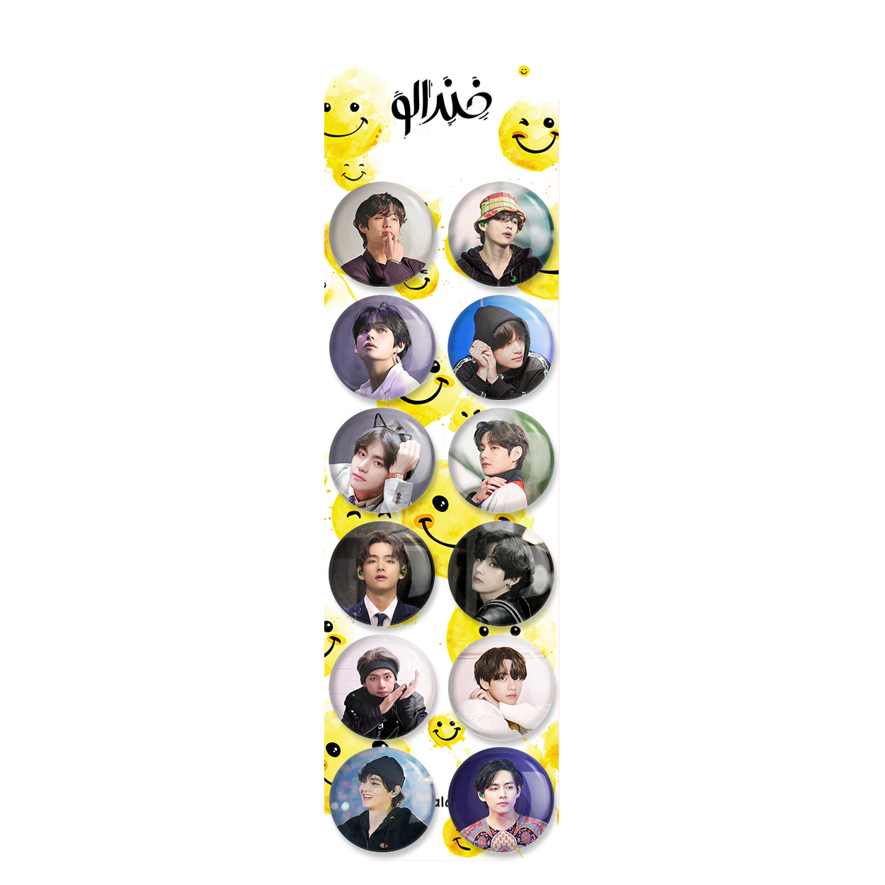 پک 12 عددی پیکسل خندالو طرح تهیونگ وی (Teahyung) بی تی اس BTS با روکش سلفون حرارتی براق ضدخش و قطعه پشتی رنگی تولید شده است. قطعات پشتی از میان 6 رنگ سفید، مشکی، صورتی، زرد، آبی و قرمز که با توجه به نوع و رنگبندی طرح روی پیکسل انتخاب شده اند تولید می شود و در هر بسته بندی مطابق عکس محصول می باشد. قطعات پلاستیکی پشت پیکسل با سوزن یک تکه ثابت و بدون لغزش و جا به جایی، ایستایی بسیار بهتری نسبت به پشتی فلزی پیکسل دارند که این مهم در تولید این محصول نیز رعایت شده است.