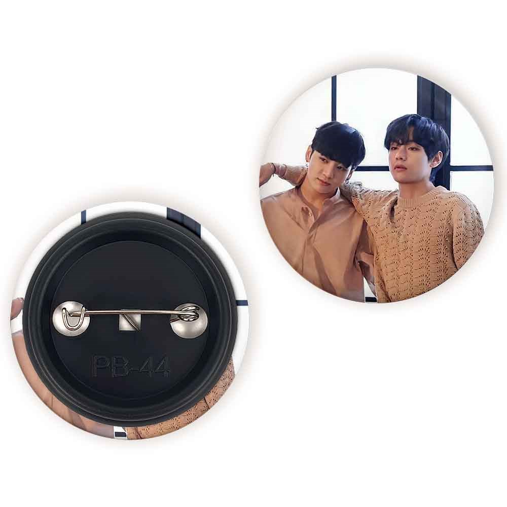 پیکسل 44 میلی متری تهیونگ و جونگ کوک ویکوک گروه بی تی اس BTS خندالو با روکش سلفون حرارتی مات مخملی ضدخش و قطعه پشتی رنگی تولید شده است.پلاستیکی پشت پیکسل با سوزن یک تکه ثابت و بدون لغزش و جا به جایی، ایستایی بسیار بهتری نسبت به پشتی فلزی پیکسل دارند که این مهم در تولید این محصول نیز رعایت شده است.