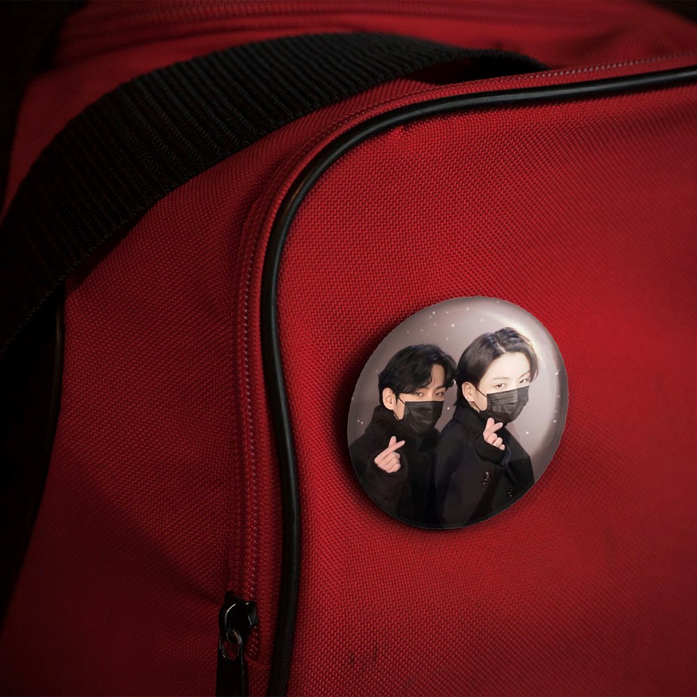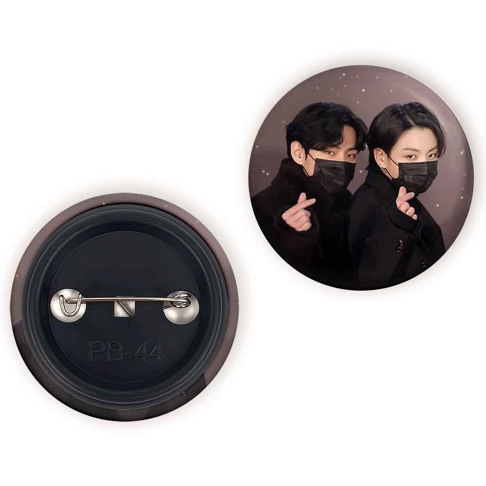 پیکسل 44 میلی متری تهیونگ و جونگ کوک ویکوک گروه بی تی اس BTS خندالو با روکش سلفون حرارتی مات مخملی ضدخش و قطعه پشتی رنگی تولید شده است.پلاستیکی پشت پیکسل با سوزن یک تکه ثابت و بدون لغزش و جا به جایی، ایستایی بسیار بهتری نسبت به پشتی فلزی پیکسل دارند که این مهم در تولید این محصول نیز رعایت شده است.