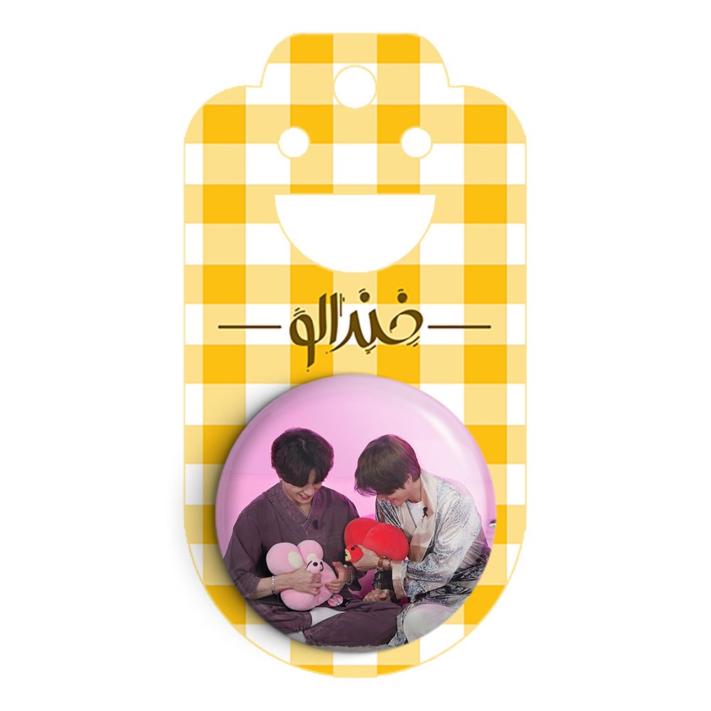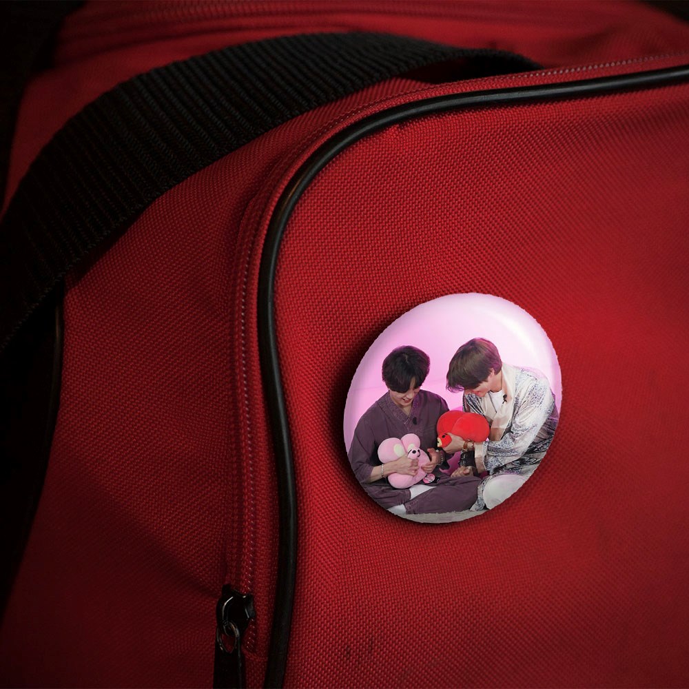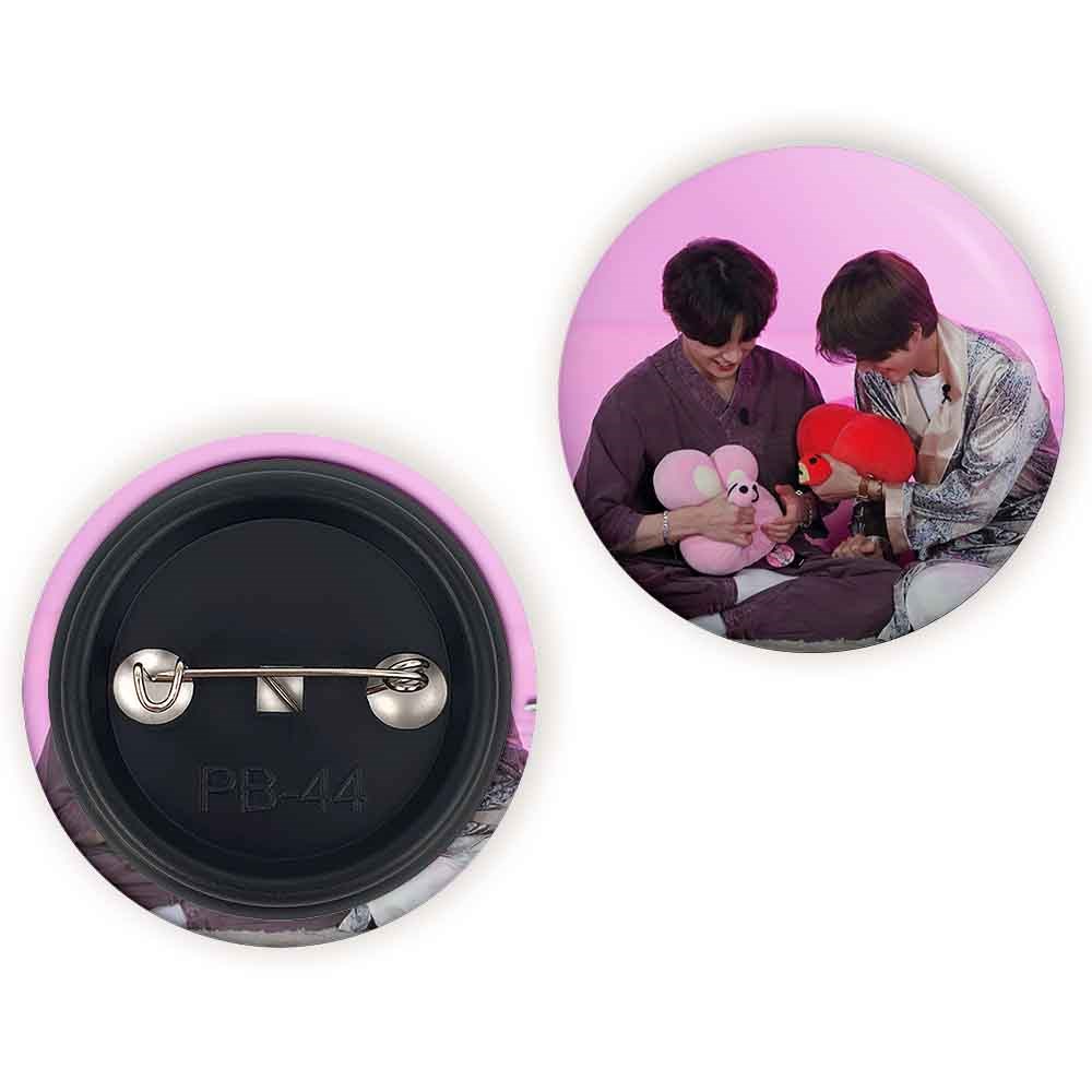 پیکسل 44 میلی متری تهیونگ و جونگ کوک ویکوک گروه بی تی اس BTS خندالو با روکش سلفون حرارتی مات مخملی ضدخش و قطعه پشتی رنگی تولید شده است.پلاستیکی پشت پیکسل با سوزن یک تکه ثابت و بدون لغزش و جا به جایی، ایستایی بسیار بهتری نسبت به پشتی فلزی پیکسل دارند که این مهم در تولید این محصول نیز رعایت شده است.