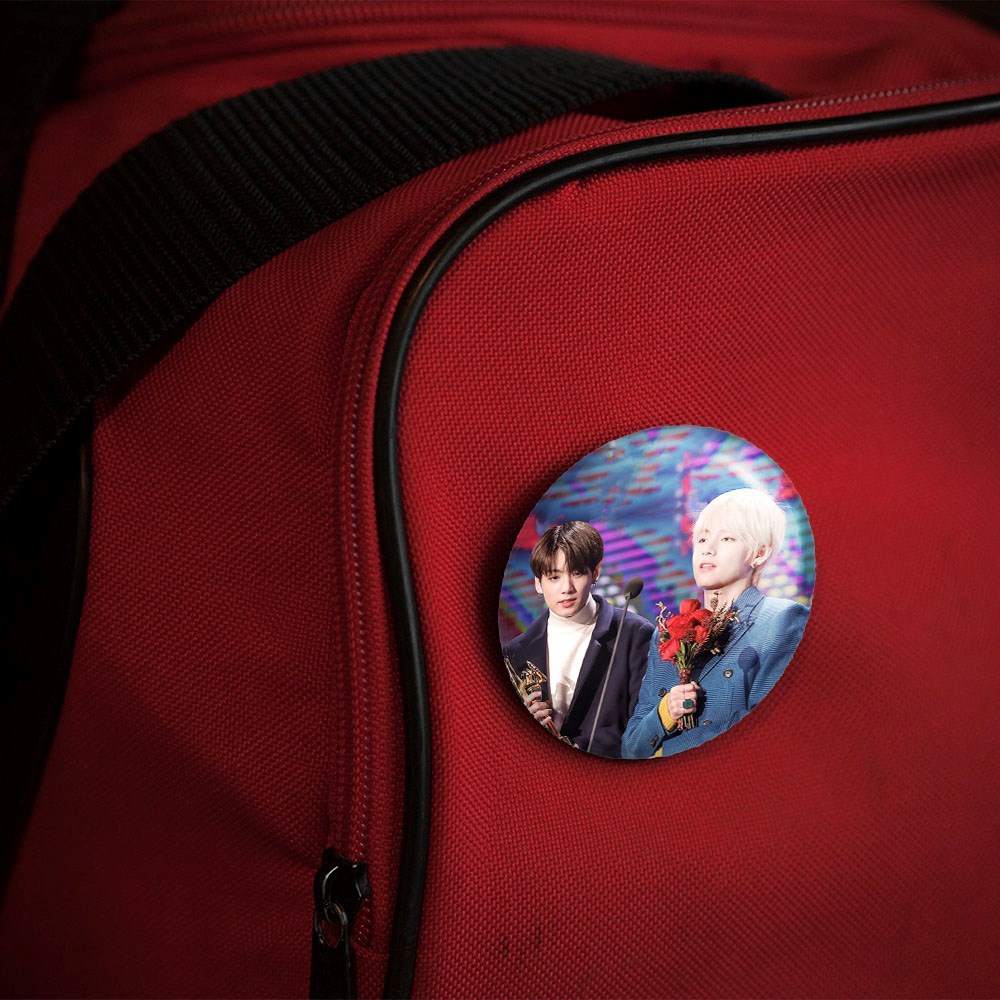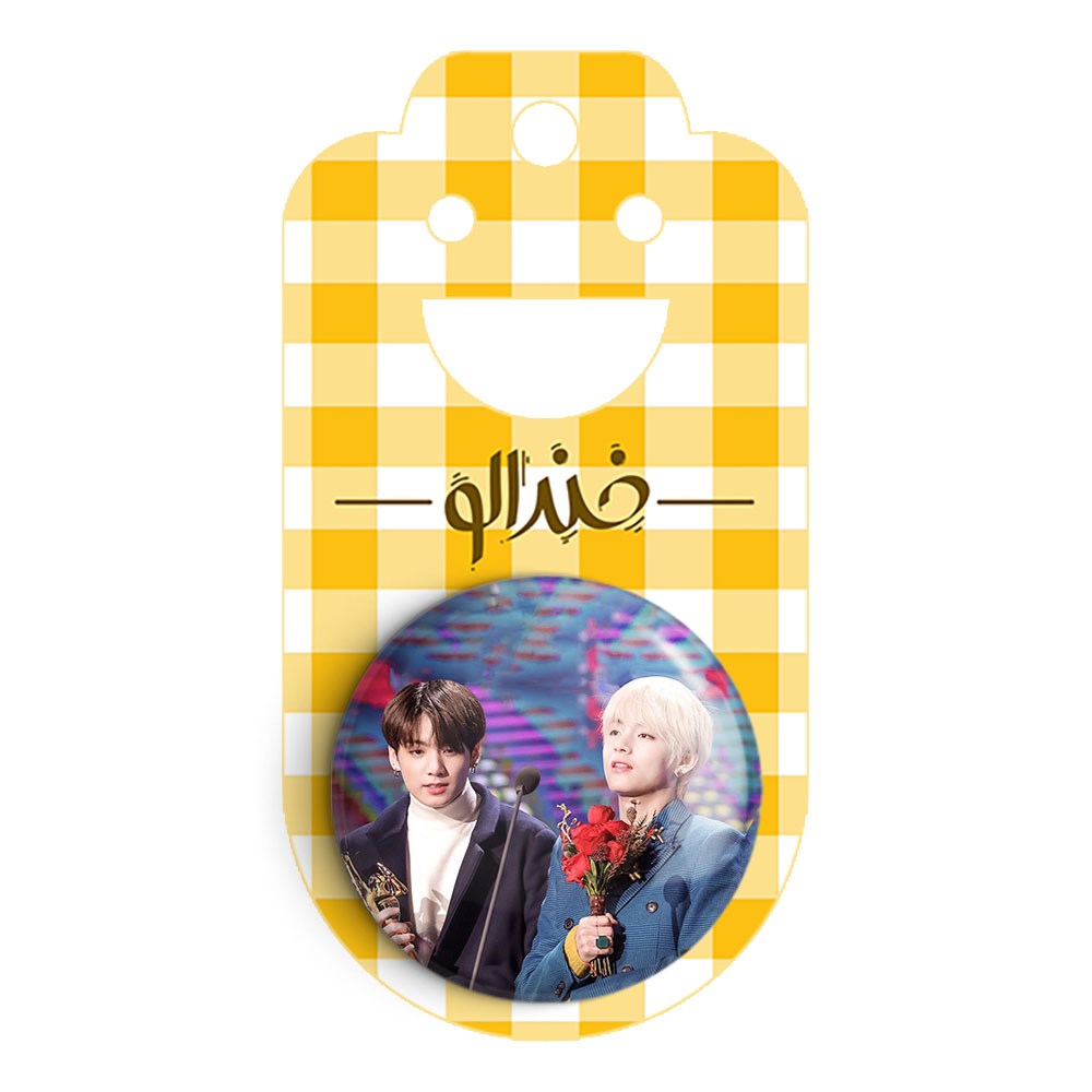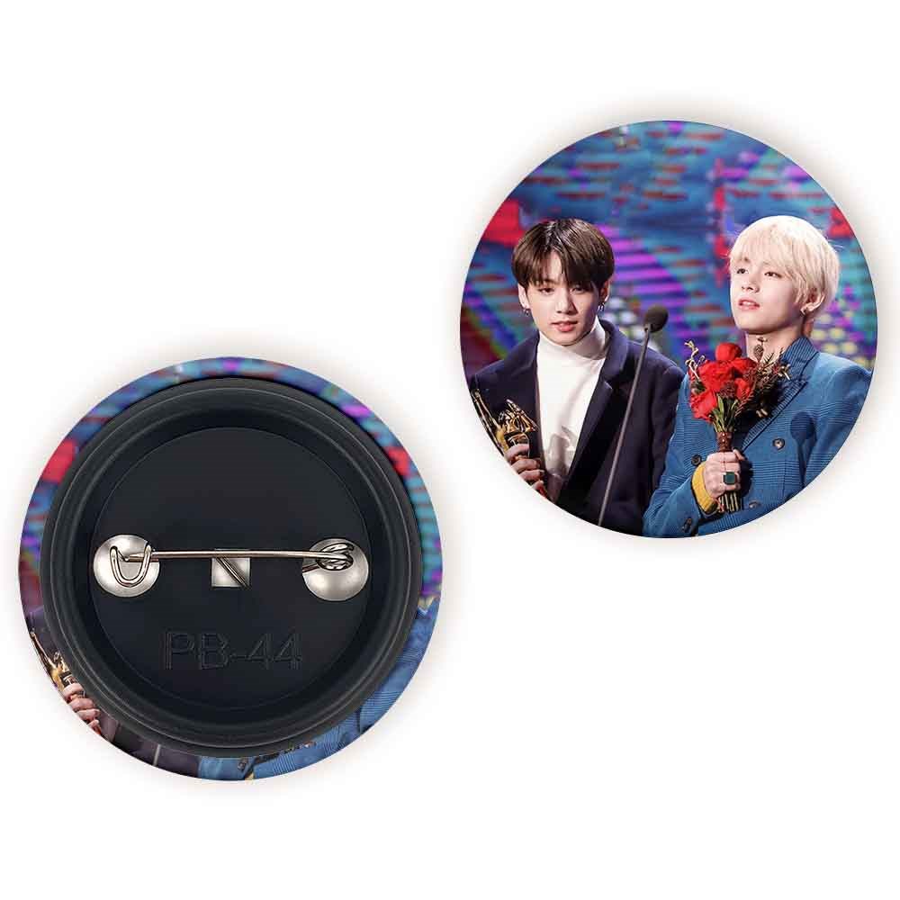 پیکسل 44 میلی متری تهیونگ و جونگ کوک ویکوک گروه بی تی اس BTS خندالو با روکش سلفون حرارتی مات مخملی ضدخش و قطعه پشتی رنگی تولید شده است.پلاستیکی پشت پیکسل با سوزن یک تکه ثابت و بدون لغزش و جا به جایی، ایستایی بسیار بهتری نسبت به پشتی فلزی پیکسل دارند که این مهم در تولید این محصول نیز رعایت شده است.