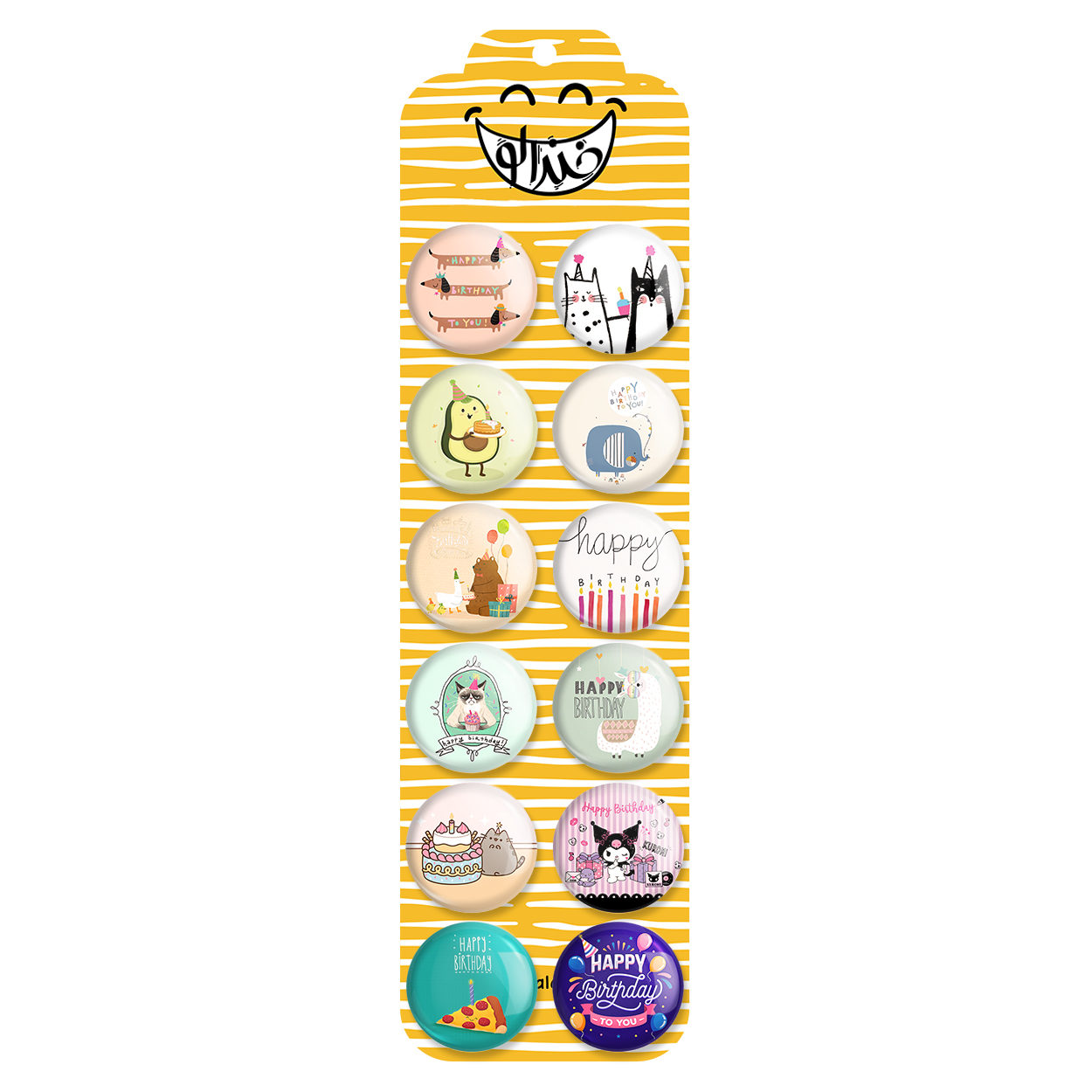پک 12 عددی پیکسل خندالو طرح تولد با روکش سلفون حرارتی براق ضدخش و قطعه پشتی رنگی تولید شده است. قطعات پشتی از میان 6 رنگ سفید، مشکی، صورتی، زرد، آبی و قرمز که با توجه به نوع و رنگبندی طرح روی پیکسل انتخاب شده اند تولید می شود و در هر بسته بندی مطابق عکس محصول می باشد. قطعات پلاستیکی پشت پیکسل با سوزن یک تکه ثابت و بدون لغزش و جا به جایی، ایستایی بسیار بهتری نسبت به پشتی فلزی پیکسل دارند که این مهم در تولید این محصول نیز رعایت شده است. چاپ پیکسل طرح تولد بسته ۱۲ عددی نیز با دستگاه های استاندارد و با بهترین سطح کیفی صورت گرفته و طرح با شفافیتی مثال زدنی و با سلفونی بدون شکست نور بر روی پیکسل نقش بسته است.