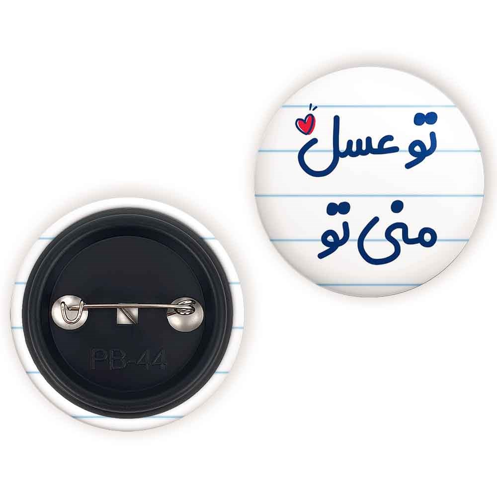 پیکسل 44 میلی متری تو عسل منی تو خندالو با روکش سلفون حرارتی مات مخملی ضدخش و قطعه پشتی رنگی تولید شده است.پلاستیکی پشت پیکسل با سوزن یک تکه ثابت و بدون لغزش و جا به جایی، ایستایی بسیار بهتری نسبت به پشتی فلزی پیکسل دارند که این مهم در تولید این محصول نیز رعایت شده است.