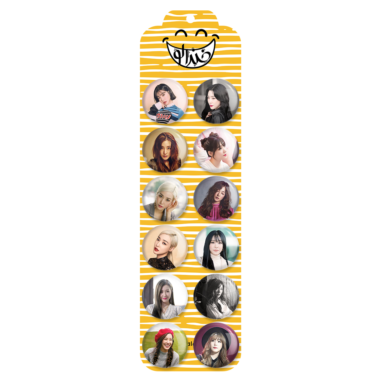 پک 12 عددی پیکسل خندالو طرح تیفانی گرلز جنریشن (Girls Genration) با روکش سلفون حرارتی براق ضدخش و قطعه پشتی رنگی تولید شده است. قطعات پشتی از میان 6 رنگ سفید، مشکی، صورتی، زرد، آبی و قرمز که با توجه به نوع و رنگبندی طرح روی پیکسل انتخاب شده اند تولید می شود و در هر بسته بندی مطابق عکس محصول می باشد. قطعات پلاستیکی پشت پیکسل با سوزن یک تکه ثابت و بدون لغزش و جا به جایی، ایستایی بسیار بهتری نسبت به پشتی فلزی پیکسل دارند که این مهم در تولید این محصول نیز رعایت شده است.
