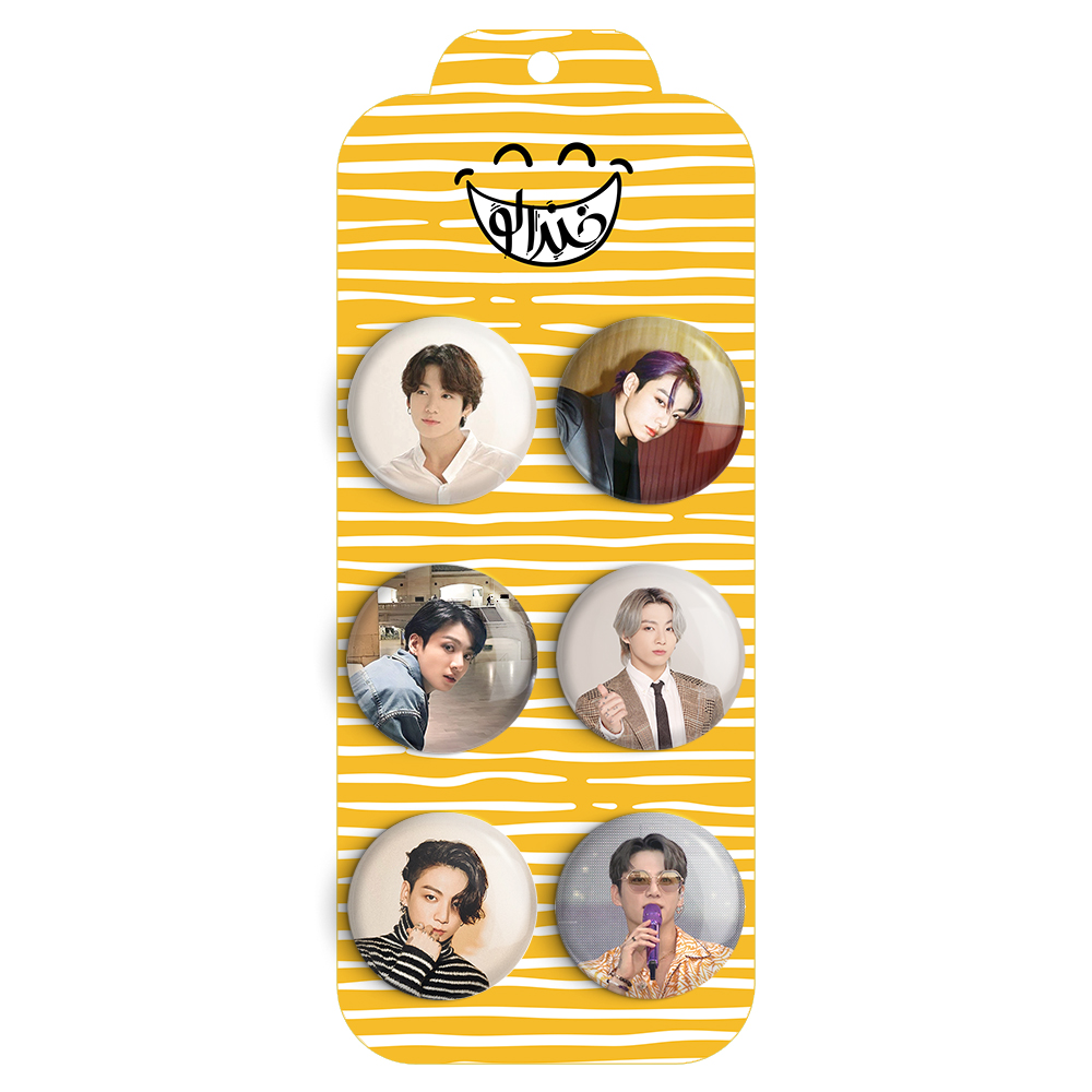 مجموعه 6 عددی پیکسل خندالو طرح جونگ‌کوک (Jungkook) گروه BTS با روکش سلفون حرارتی براق ضدخش و قطعه پشتی رنگی تولید شده است. قطعات پشتی از میان 6 رنگ سفید، مشکی، صورتی، زرد، آبی و قرمز که با توجه به نوع و رنگبندی طرح روی پیکسل انتخاب شده اند تولید می شود و در هر بسته بندی مطابق عکس محصول می باشد.