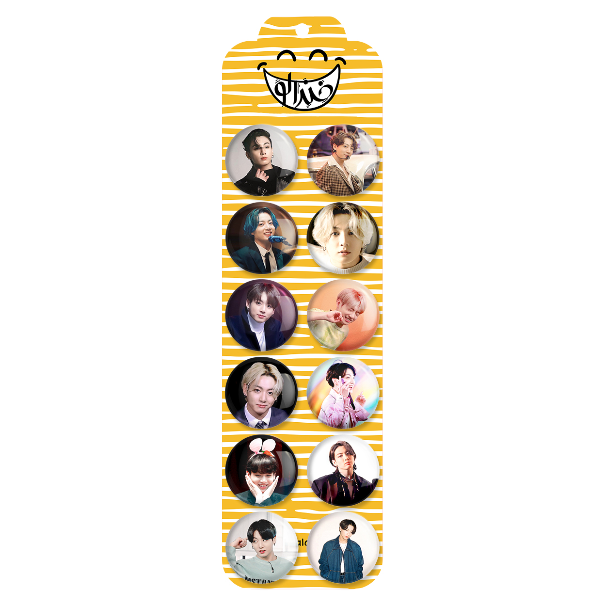 پک 12 عددی پیکسل خندالو طرح جونگ کوک (Jung kook) بی تی اس BTS با روکش سلفون حرارتی براق ضدخش و قطعه پشتی رنگی تولید شده است. قطعات پشتی از میان 6 رنگ سفید، مشکی، صورتی، زرد، آبی و قرمز که با توجه به نوع و رنگبندی طرح روی پیکسل انتخاب شده اند تولید می شود و در هر بسته بندی مطابق عکس محصول می باشد. قطعات پلاستیکی پشت پیکسل با سوزن یک تکه ثابت و بدون لغزش و جا به جایی، ایستایی بسیار بهتری نسبت به پشتی فلزی پیکسل دارند که این مهم در تولید این محصول نیز رعایت شده است. چاپ پیکسل طرح جونگ کوک (Jung kook) بی تی اس BTS بسته ۱۲ عددی نیز با دستگاه های استاندارد و با بهترین سطح کیفی صورت گرفته و طرح با شفافیتی مثال زدنی و با سلفونی بدون شکست نور بر روی پیکسل نقش بسته است.