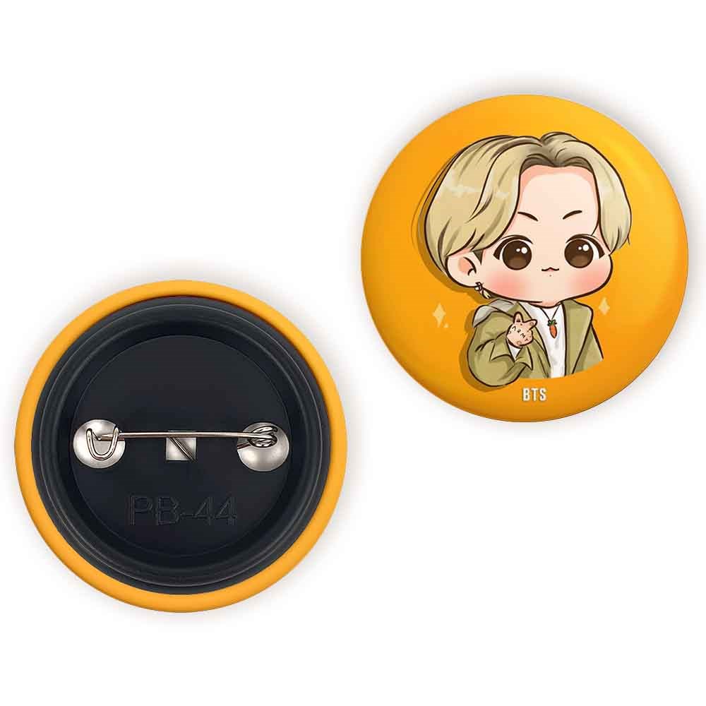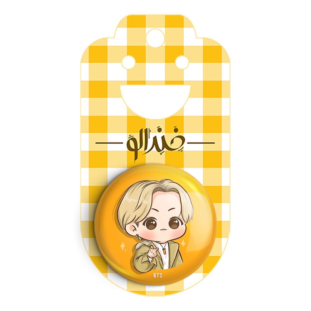 پیکسل 44 میلی متری جونگ کوک Jungkook گروه بی تی اس BTS خندالو با روکش سلفون حرارتی مات مخملی ضدخش و قطعه پشتی رنگی تولید شده است.پلاستیکی پشت پیکسل با سوزن یک تکه ثابت و بدون لغزش و جا به جایی، ایستایی بسیار بهتری نسبت به پشتی فلزی پیکسل دارند که این مهم در تولید این محصول نیز رعایت شده است.