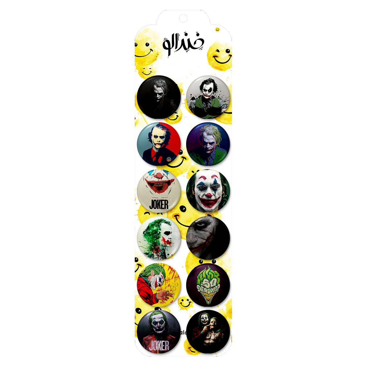 پک 12 عددی پیکسل خندالو طرح جوکر (Joker) با روکش سلفون حرارتی براق ضدخش و قطعه پشتی رنگی تولید شده است. قطعات پشتی از میان 6 رنگ سفید، مشکی، صورتی، زرد، آبی و قرمز که با توجه به نوع و رنگبندی طرح روی پیکسل انتخاب شده اند تولید می شود و در هر بسته بندی مطابق عکس محصول می باشد. قطعات پلاستیکی پشت پیکسل با سوزن یک تکه ثابت و بدون لغزش و جا به جایی، ایستایی بسیار بهتری نسبت به پشتی فلزی پیکسل دارند که این مهم در تولید این محصول نیز رعایت شده است.