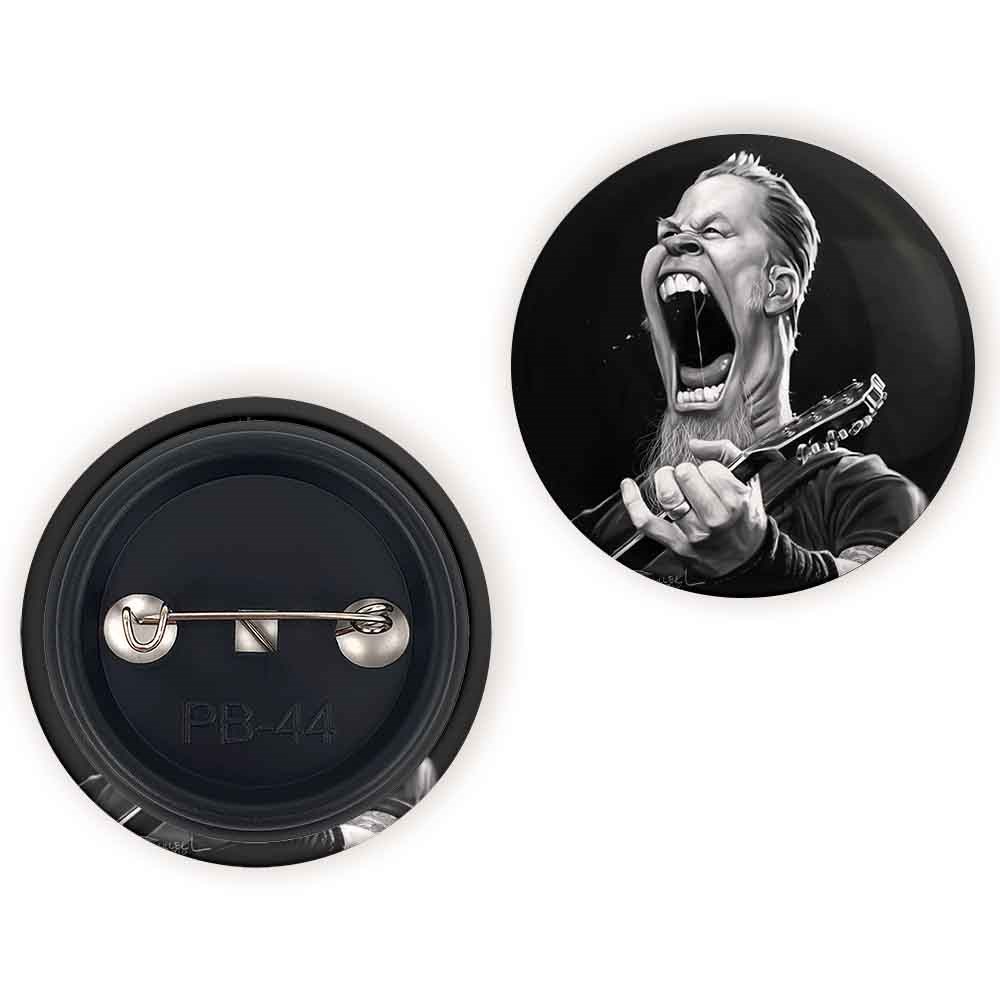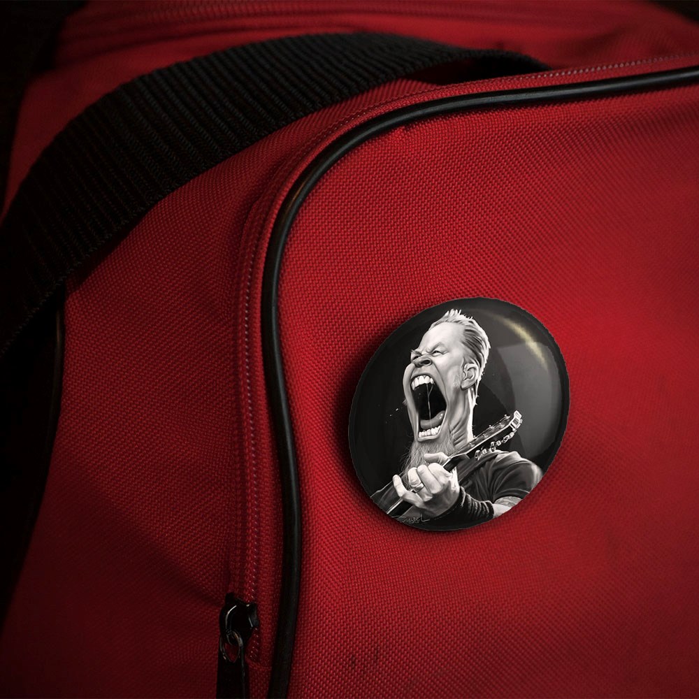 پیکسل 44 میلی متری جیمز هتفیلد گروه موسیقی متالیکا Metallica خندالو با روکش سلفون حرارتی مات مخملی ضدخش و قطعه پشتی رنگی تولید شده است.پلاستیکی پشت پیکسل با سوزن یک تکه ثابت و بدون لغزش و جا به جایی، ایستایی بسیار بهتری نسبت به پشتی فلزی پیکسل دارند که این مهم در تولید این محصول نیز رعایت شده است.