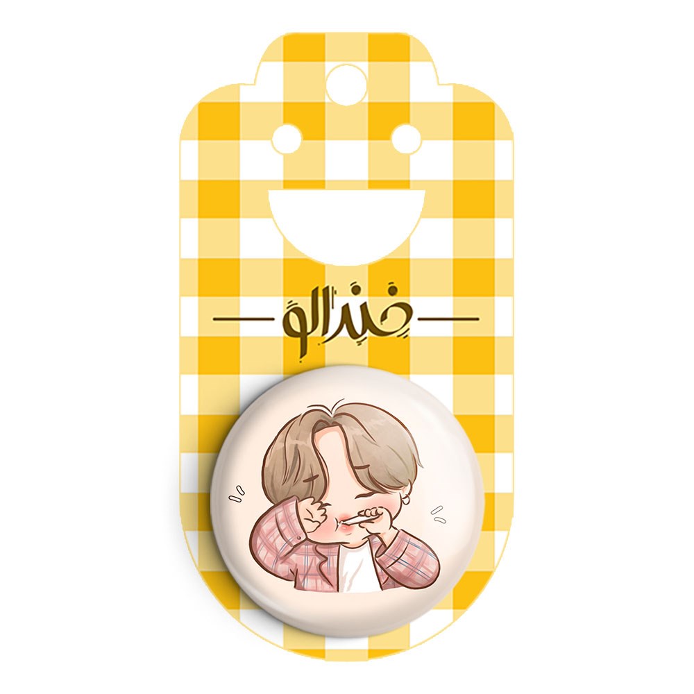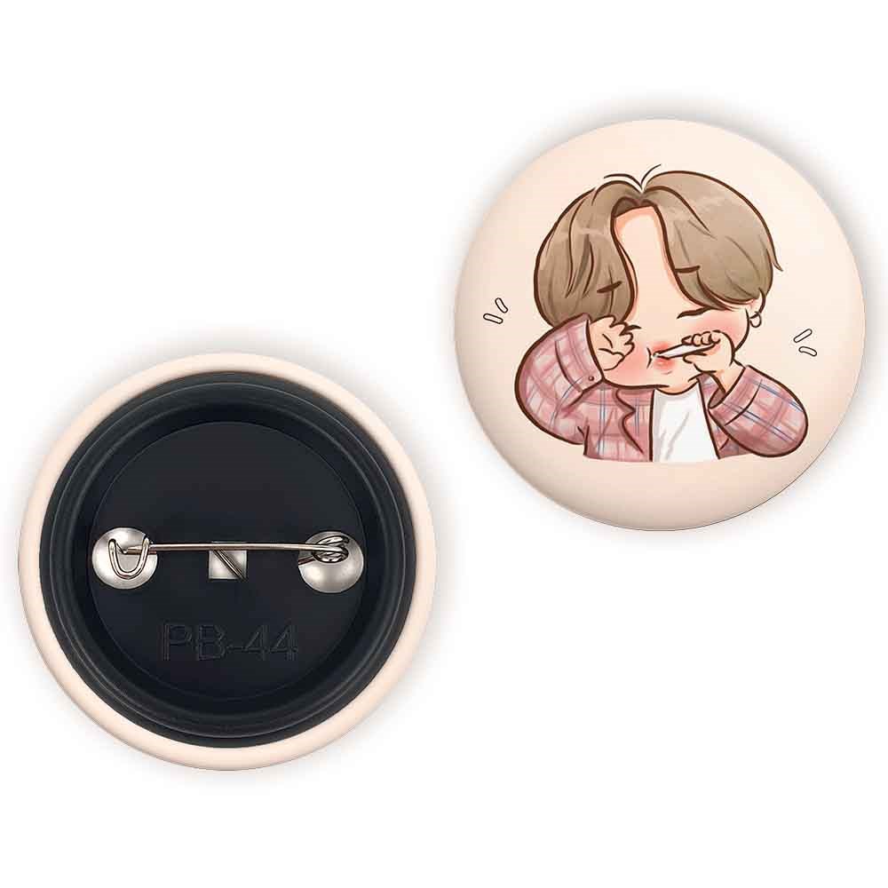پیکسل 44 میلی متری جیمین Jimin گروه بی تی اس BTS خندالو با روکش سلفون حرارتی مات مخملی ضدخش و قطعه پشتی رنگی تولید شده است.پلاستیکی پشت پیکسل با سوزن یک تکه ثابت و بدون لغزش و جا به جایی، ایستایی بسیار بهتری نسبت به پشتی فلزی پیکسل دارند که این مهم در تولید این محصول نیز رعایت شده است.