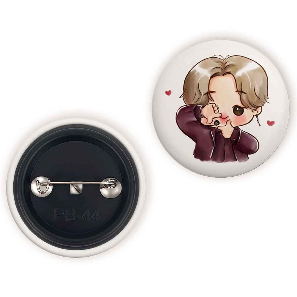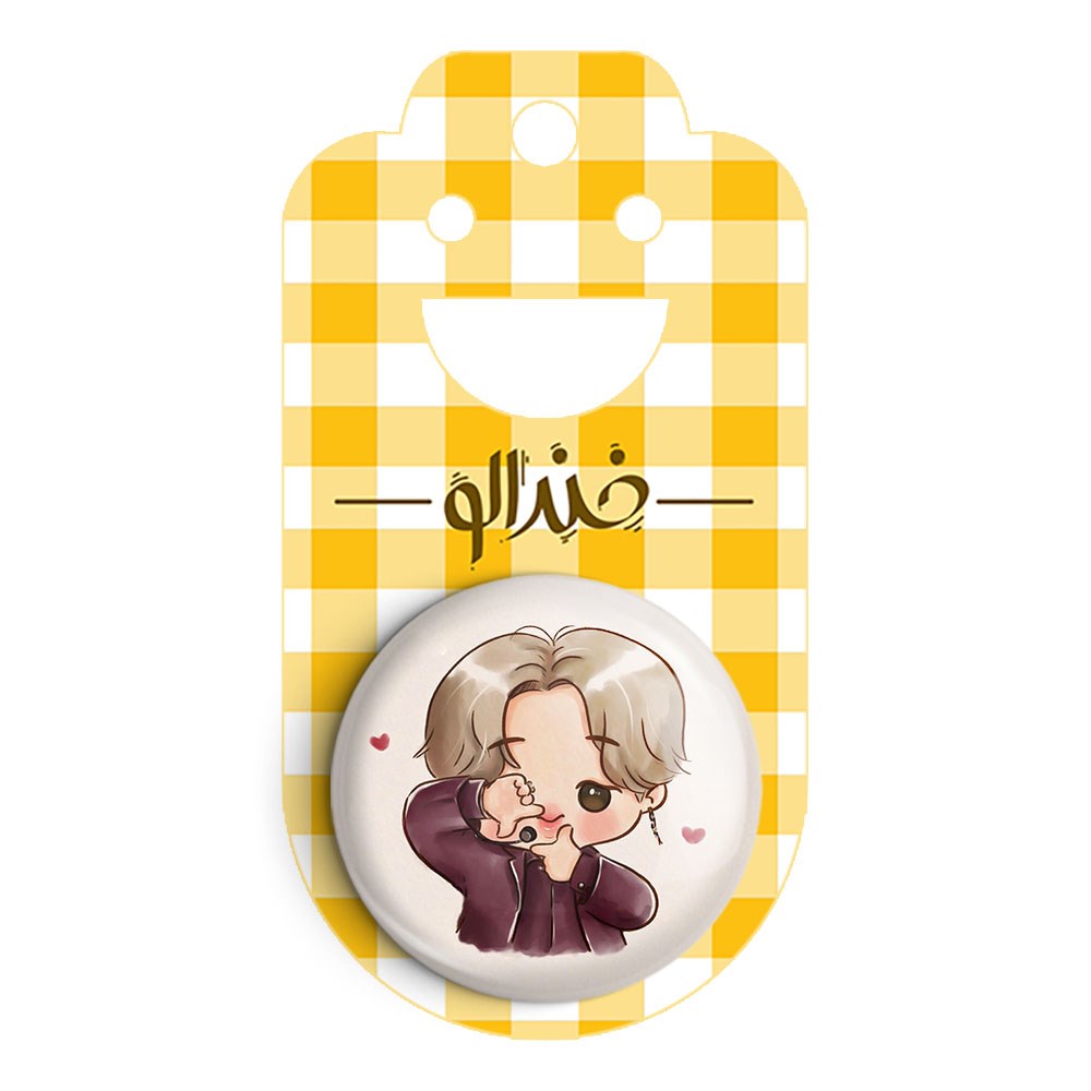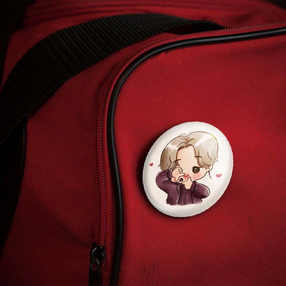 پیکسل 44 میلی متری جیمین Jimin گروه بی تی اس BTS خندالو با روکش سلفون حرارتی مات مخملی ضدخش و قطعه پشتی رنگی تولید شده است.پلاستیکی پشت پیکسل با سوزن یک تکه ثابت و بدون لغزش و جا به جایی، ایستایی بسیار بهتری نسبت به پشتی فلزی پیکسل دارند که این مهم در تولید این محصول نیز رعایت شده است.