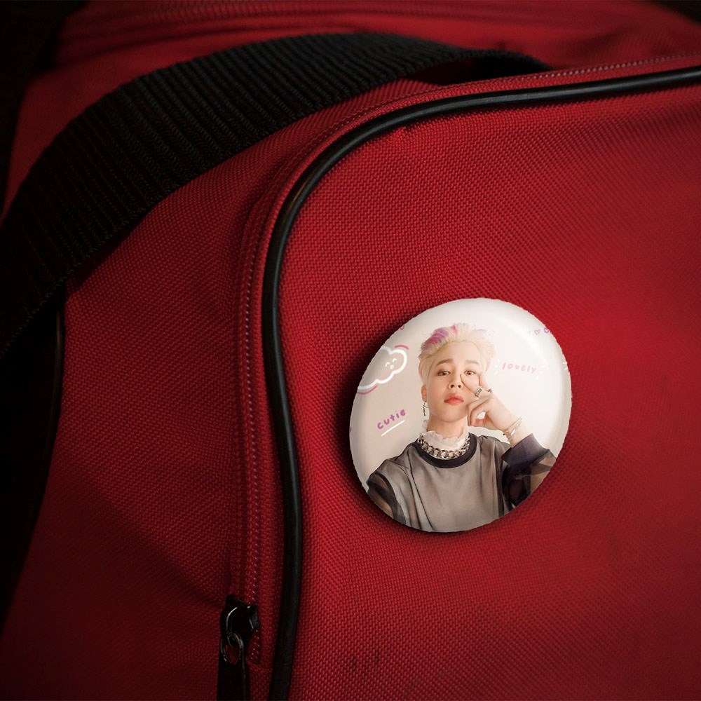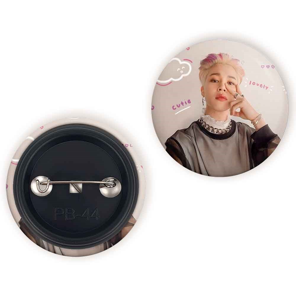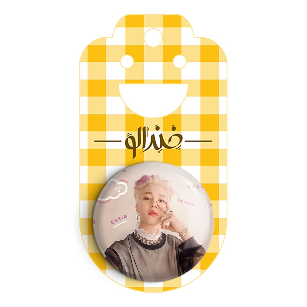 پیکسل 44 میلی متری جیمین Jimin گروه بی تی اس BTS خندالو با روکش سلفون حرارتی مات مخملی ضدخش و قطعه پشتی رنگی تولید شده است.پلاستیکی پشت پیکسل با سوزن یک تکه ثابت و بدون لغزش و جا به جایی، ایستایی بسیار بهتری نسبت به پشتی فلزی پیکسل دارند که این مهم در تولید این محصول نیز رعایت شده است.