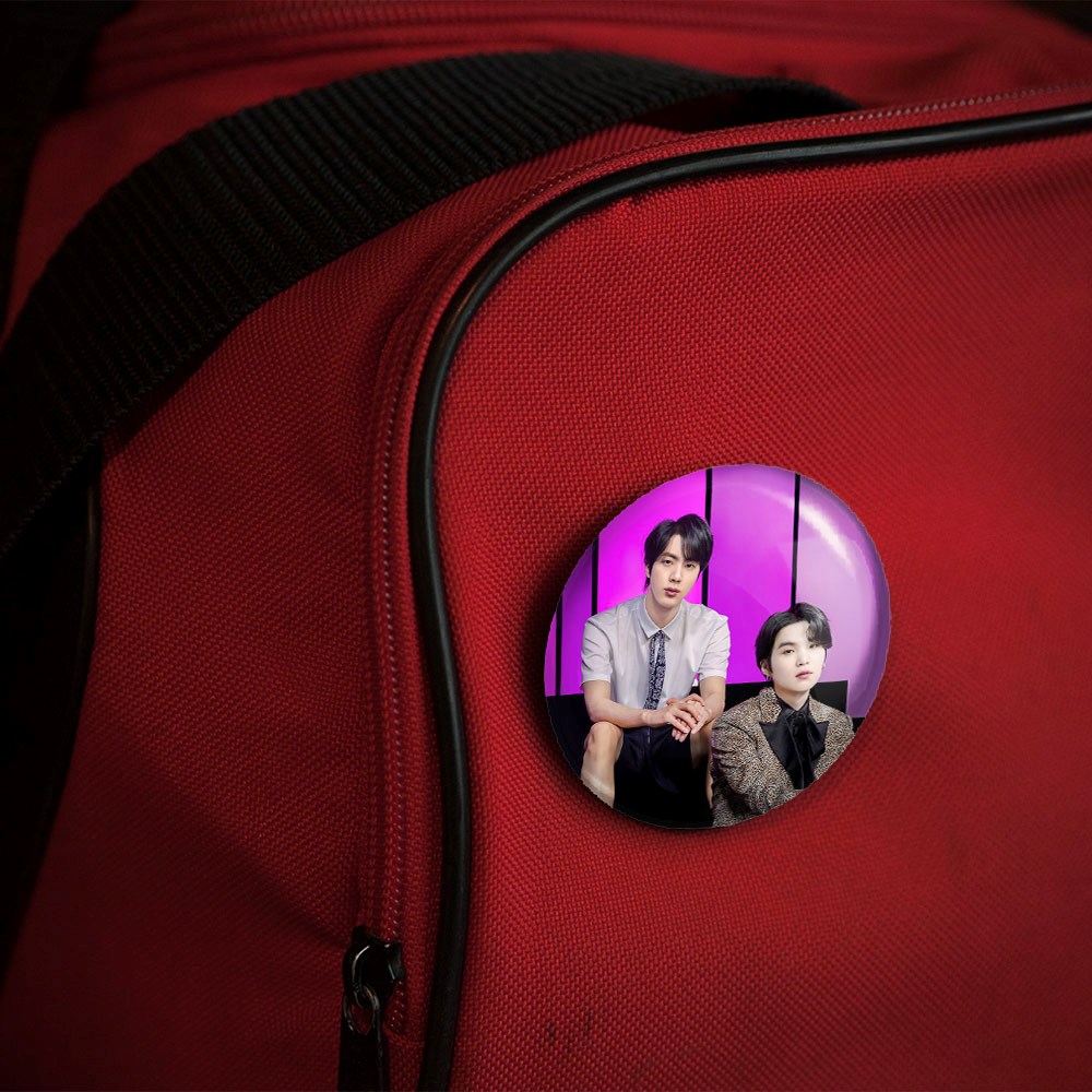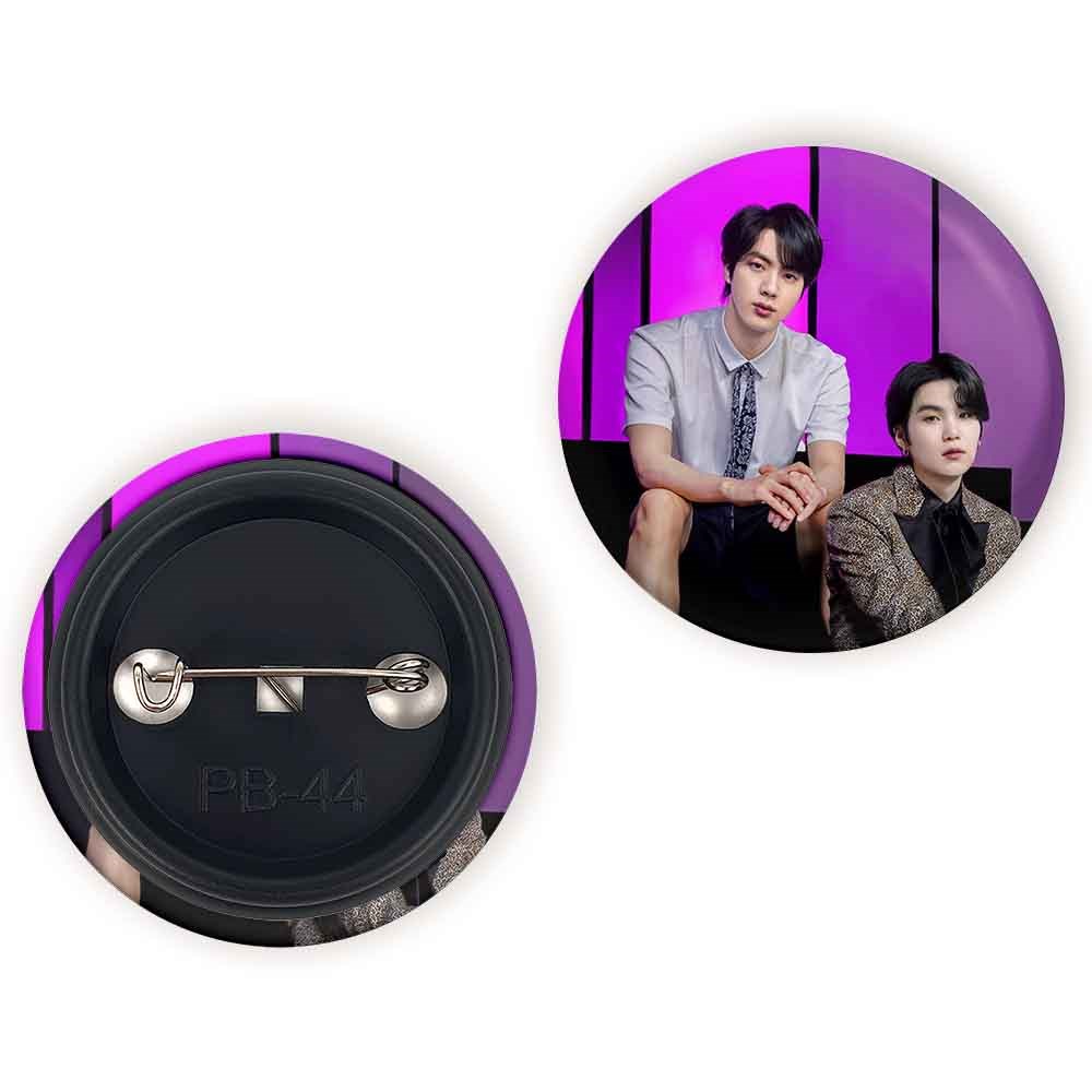 پیکسل 44 میلی متری جین Jin و شوگا Suga گروه بی تی اس BTS خندالو با روکش سلفون حرارتی مات مخملی ضدخش و قطعه پشتی رنگی تولید شده است. قطعات پلاستیکی پشت پیکسل با سوزن یک تکه ثابت و بدون لغزش و جا به جایی، ایستایی بسیار بهتری نسبت به پشتی فلزی پیکسل دارند که این مهم در تولید این محصول نیز رعایت شده است. چاپ پیکسل جین Jin و شوگا Suga گروه بی تی اس BTS نیز با دستگاه های استاندارد و با بهترین سطح کیفی صورت گرفته و طرح با شفافیتی مثال زدنی و با سلفونی بدون شکست نور بر روی پیکسل نقش بسته است. همچنین بسته بندی جذاب و مینیمال پیکسل جین Jin و شوگا Suga گروه بی تی اس BTS ، آنها را مناسب هدیه کرده است.