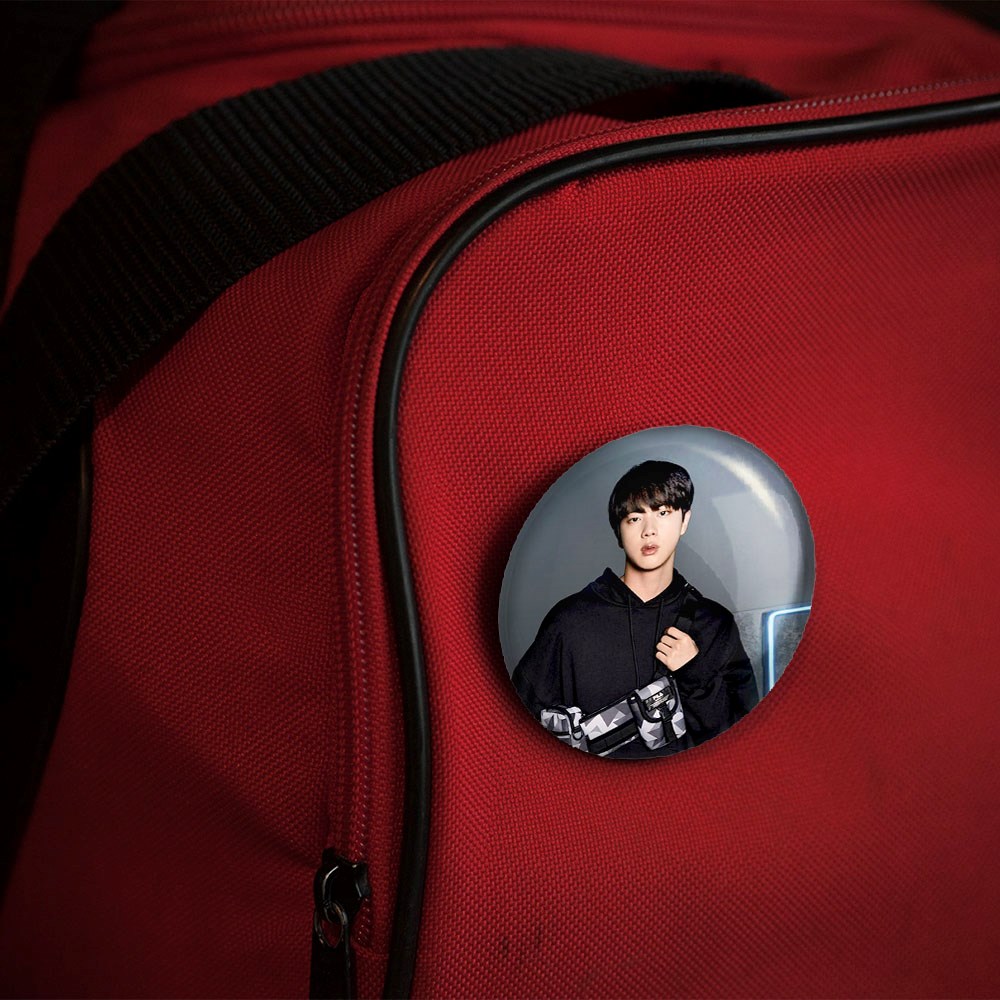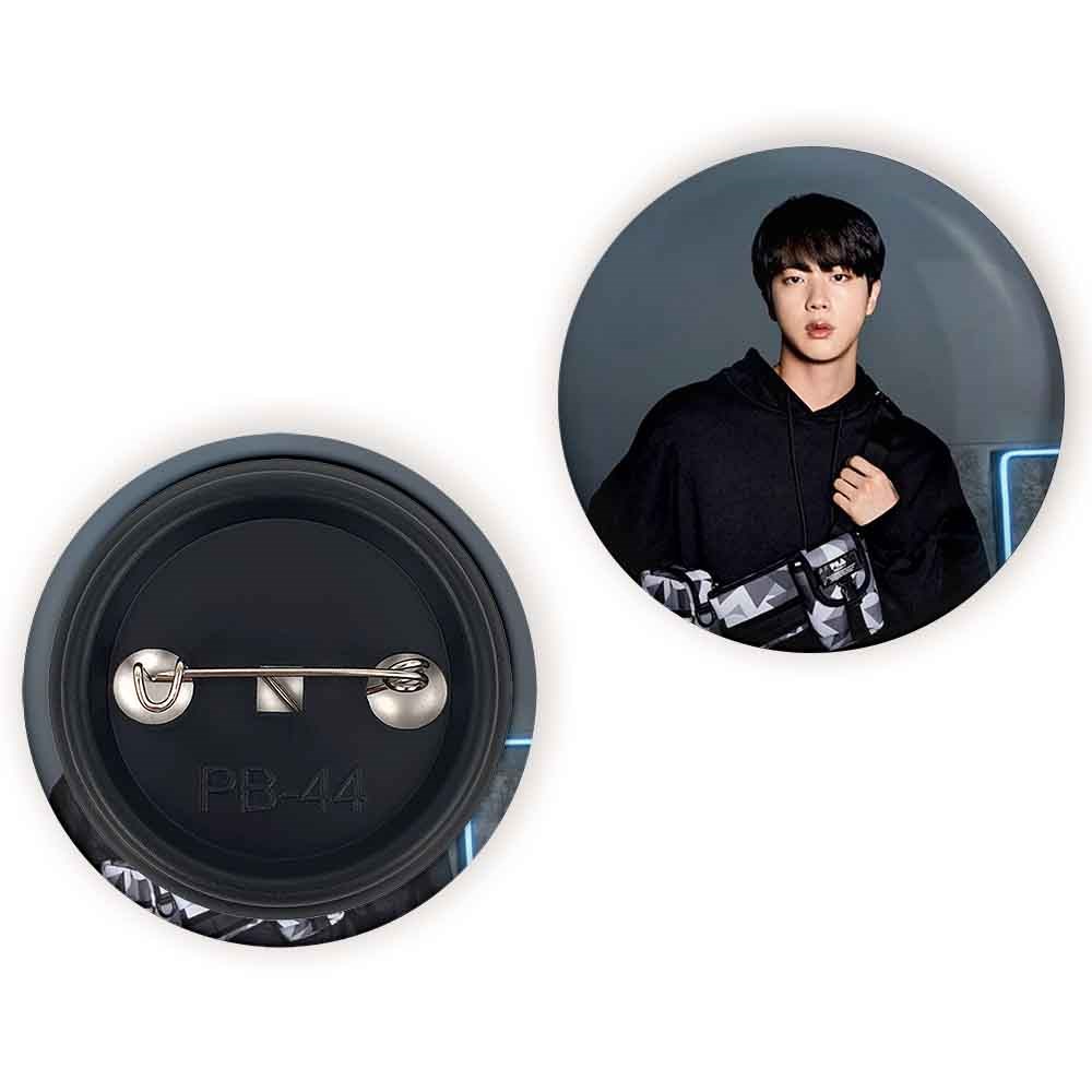 پیکسل 44 میلی متری جین Jin گروه بی تی اس BTS خندالو با روکش سلفون حرارتی مات مخملی ضدخش و قطعه پشتی رنگی تولید شده است.پلاستیکی پشت پیکسل با سوزن یک تکه ثابت و بدون لغزش و جا به جایی، ایستایی بسیار بهتری نسبت به پشتی فلزی پیکسل دارند که این مهم در تولید این محصول نیز رعایت شده است.