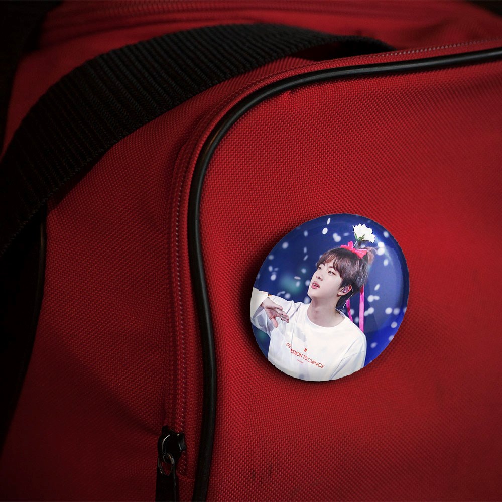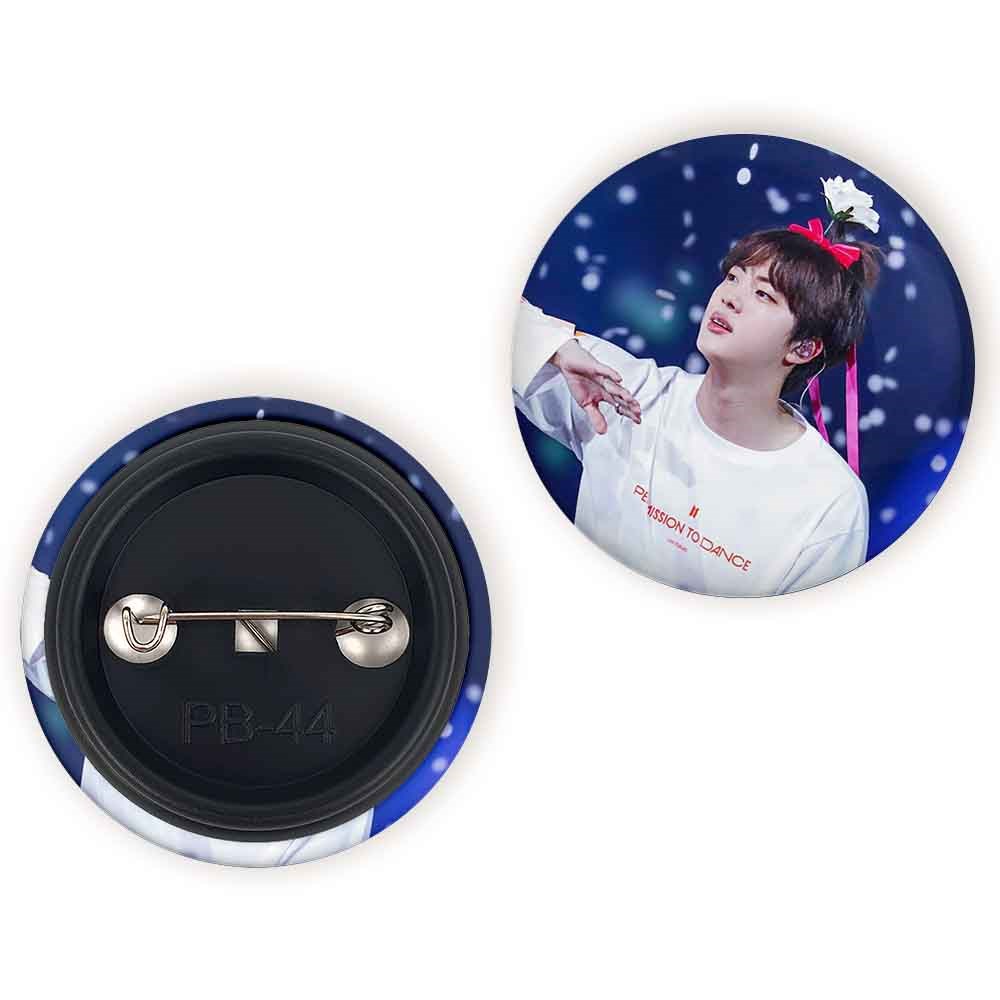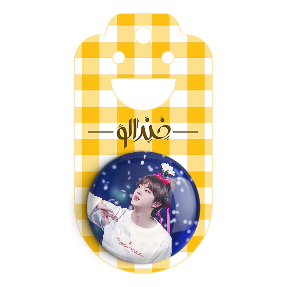 پیکسل 44 میلی متری جین Jin گروه بی تی اس BTS خندالو با روکش سلفون حرارتی مات مخملی ضدخش و قطعه پشتی رنگی تولید شده است.پلاستیکی پشت پیکسل با سوزن یک تکه ثابت و بدون لغزش و جا به جایی، ایستایی بسیار بهتری نسبت به پشتی فلزی پیکسل دارند که این مهم در تولید این محصول نیز رعایت شده است.