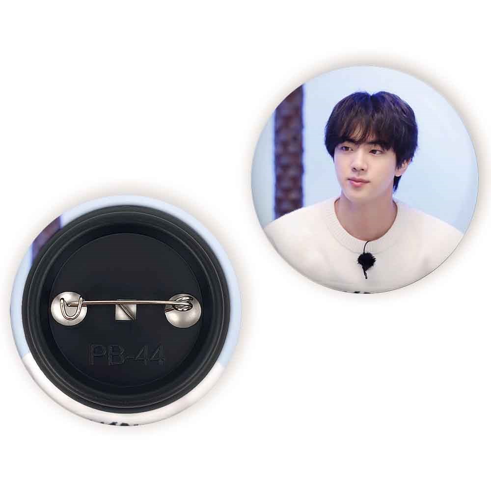 پیکسل 44 میلی متری جین Jin گروه بی تی اس BTS خندالو با روکش سلفون حرارتی مات مخملی ضدخش و قطعه پشتی رنگی تولید شده است.پلاستیکی پشت پیکسل با سوزن یک تکه ثابت و بدون لغزش و جا به جایی، ایستایی بسیار بهتری نسبت به پشتی فلزی پیکسل دارند که این مهم در تولید این محصول نیز رعایت شده است.