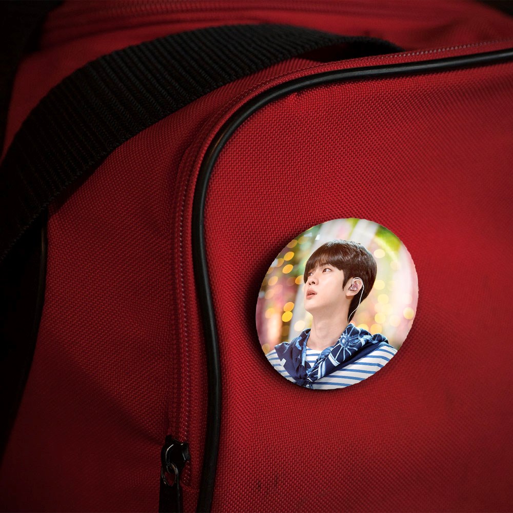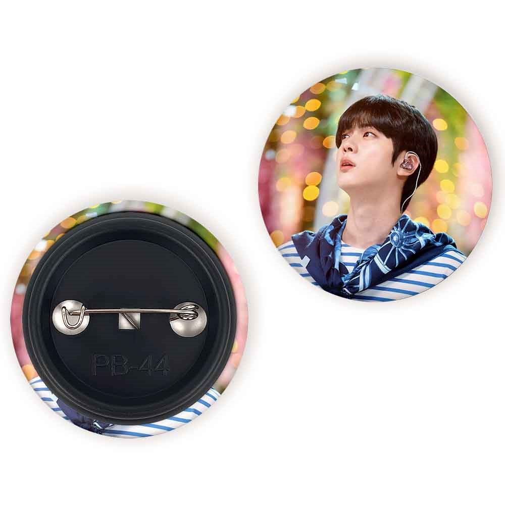 پیکسل 44 میلی متری جین Jin گروه بی تی اس BTS خندالو با روکش سلفون حرارتی مات مخملی ضدخش و قطعه پشتی رنگی تولید شده است.پلاستیکی پشت پیکسل با سوزن یک تکه ثابت و بدون لغزش و جا به جایی، ایستایی بسیار بهتری نسبت به پشتی فلزی پیکسل دارند که این مهم در تولید این محصول نیز رعایت شده است.