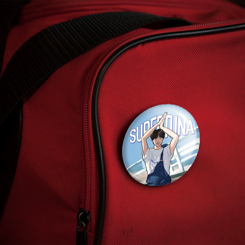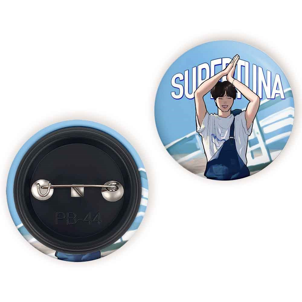 پیکسل 44 میلی متری جین Jin گروه بی تی اس BTS خندالو با روکش سلفون حرارتی مات مخملی ضدخش و قطعه پشتی رنگی تولید شده است.پلاستیکی پشت پیکسل با سوزن یک تکه ثابت و بدون لغزش و جا به جایی، ایستایی بسیار بهتری نسبت به پشتی فلزی پیکسل دارند که این مهم در تولید این محصول نیز رعایت شده است.