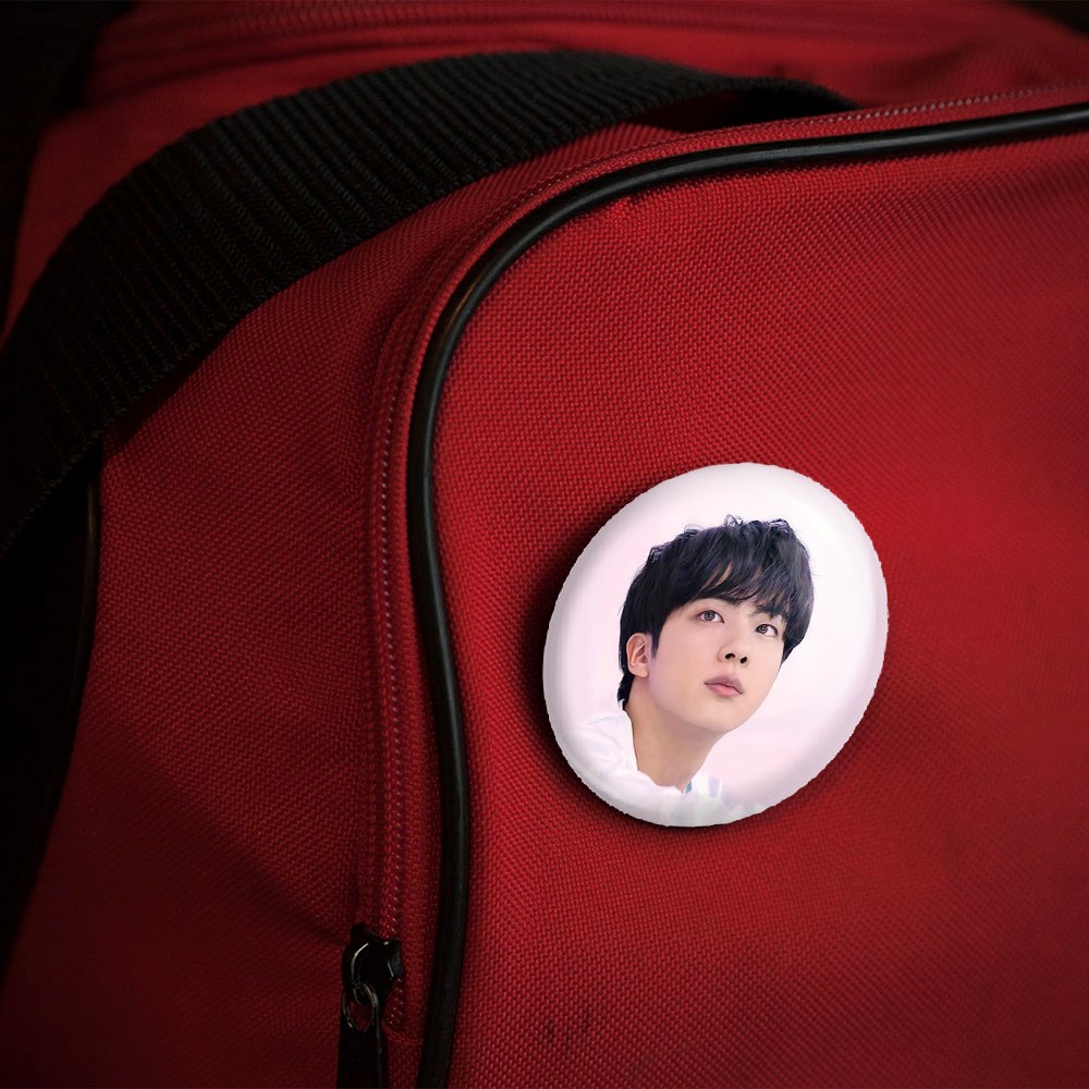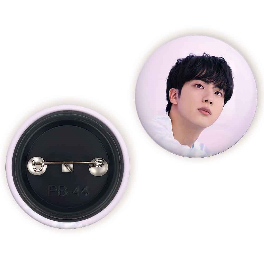 پیکسل 44 میلی متری جین Jin گروه بی تی اس BTS خندالو با روکش سلفون حرارتی مات مخملی ضدخش و قطعه پشتی رنگی تولید شده است.پلاستیکی پشت پیکسل با سوزن یک تکه ثابت و بدون لغزش و جا به جایی، ایستایی بسیار بهتری نسبت به پشتی فلزی پیکسل دارند که این مهم در تولید این محصول نیز رعایت شده است.
