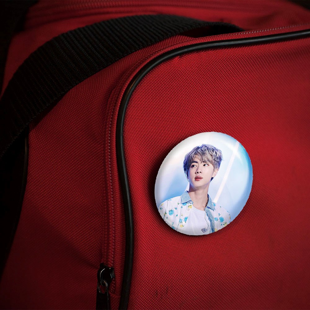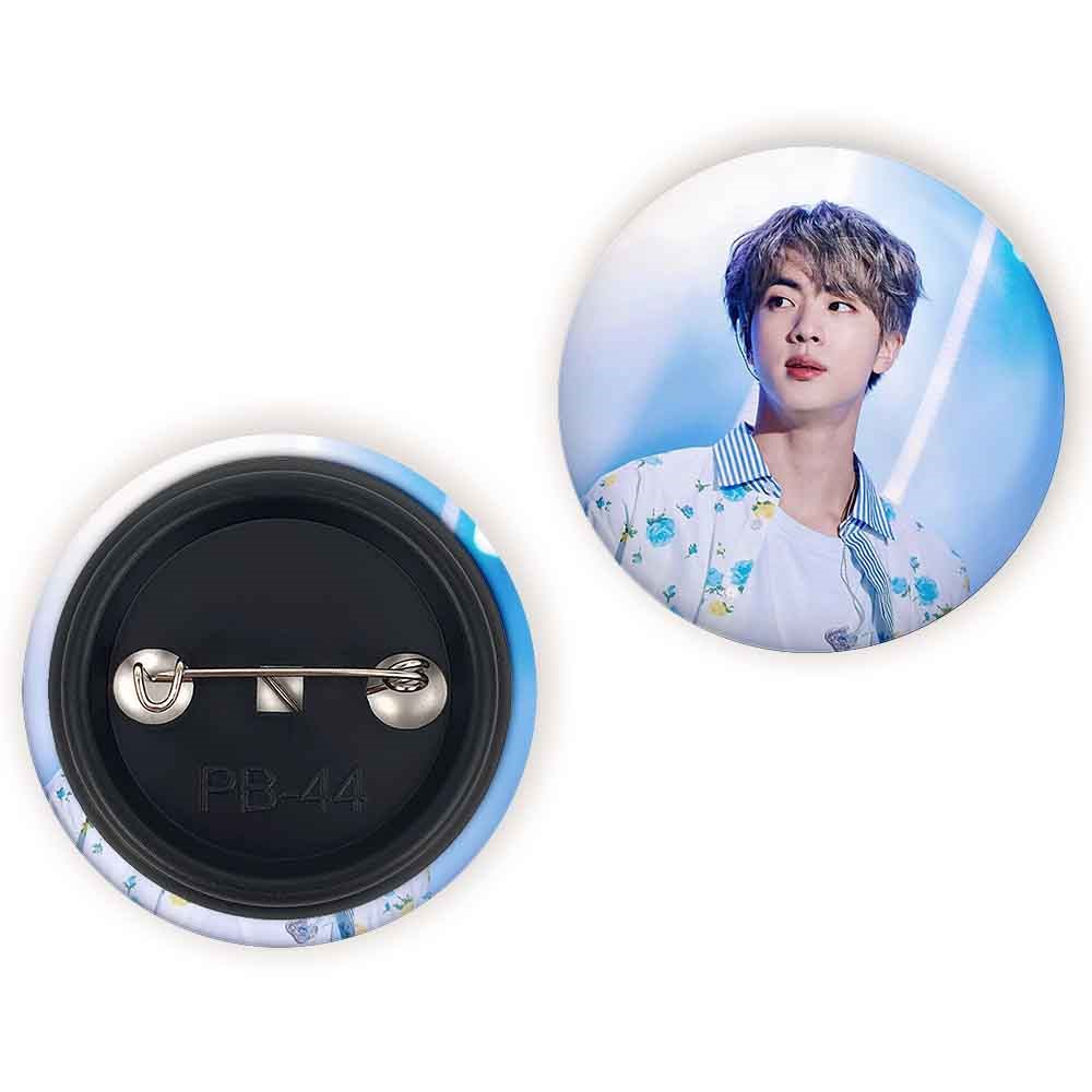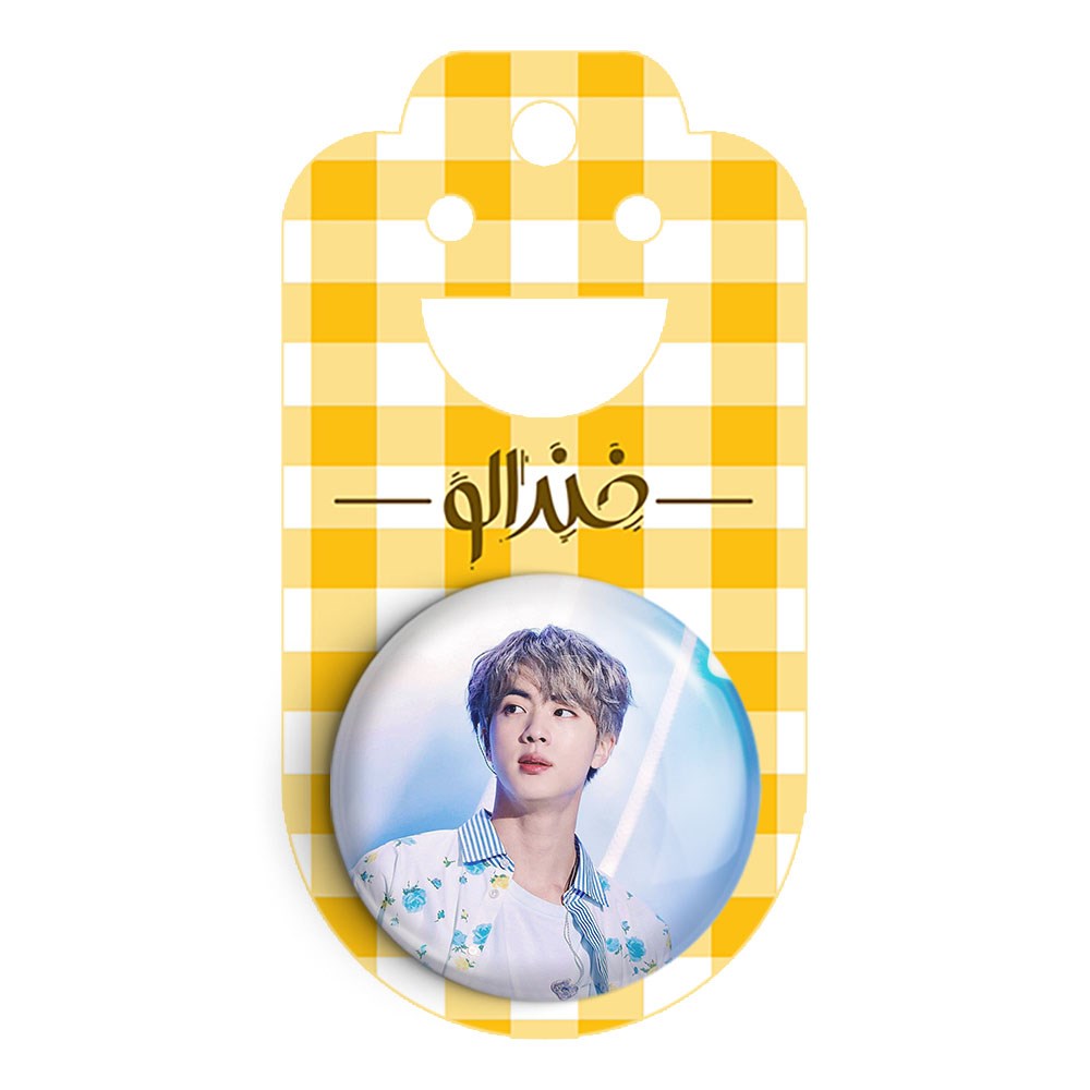 پیکسل 44 میلی متری جین Jin گروه بی تی اس BTS خندالو با روکش سلفون حرارتی مات مخملی ضدخش و قطعه پشتی رنگی تولید شده است.پلاستیکی پشت پیکسل با سوزن یک تکه ثابت و بدون لغزش و جا به جایی، ایستایی بسیار بهتری نسبت به پشتی فلزی پیکسل دارند که این مهم در تولید این محصول نیز رعایت شده است.