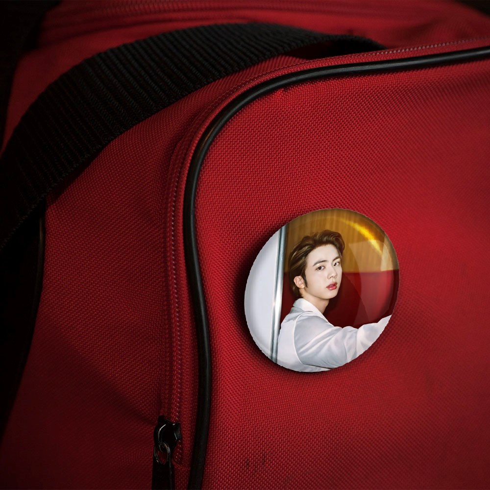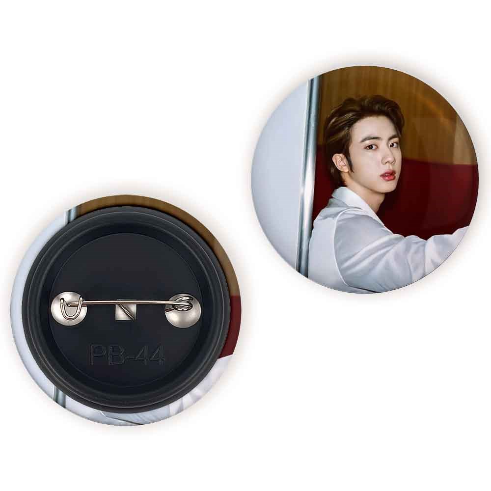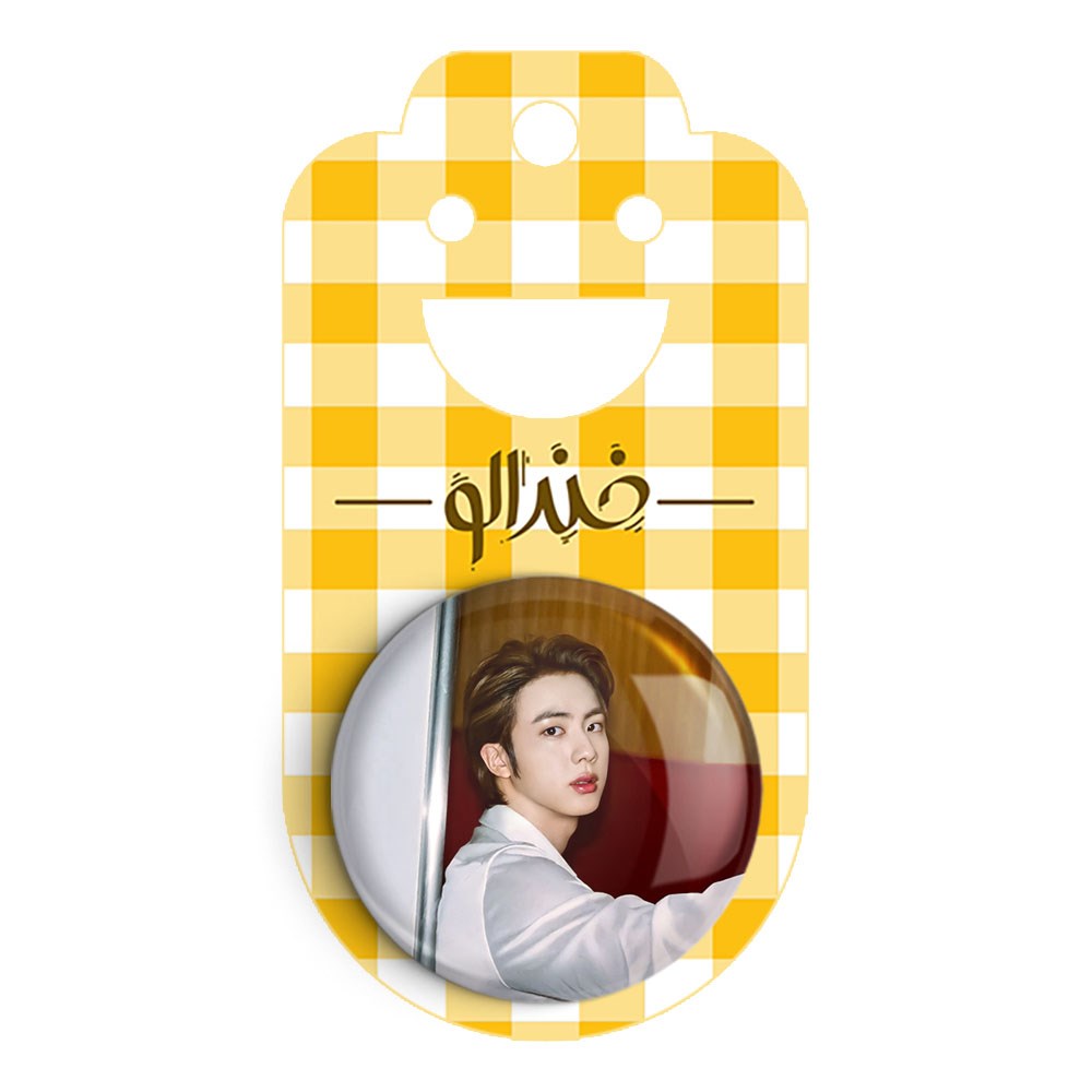 پیکسل 44 میلی متری جین Jin گروه بی تی اس BTS خندالو با روکش سلفون حرارتی مات مخملی ضدخش و قطعه پشتی رنگی تولید شده است.پلاستیکی پشت پیکسل با سوزن یک تکه ثابت و بدون لغزش و جا به جایی، ایستایی بسیار بهتری نسبت به پشتی فلزی پیکسل دارند که این مهم در تولید این محصول نیز رعایت شده است.