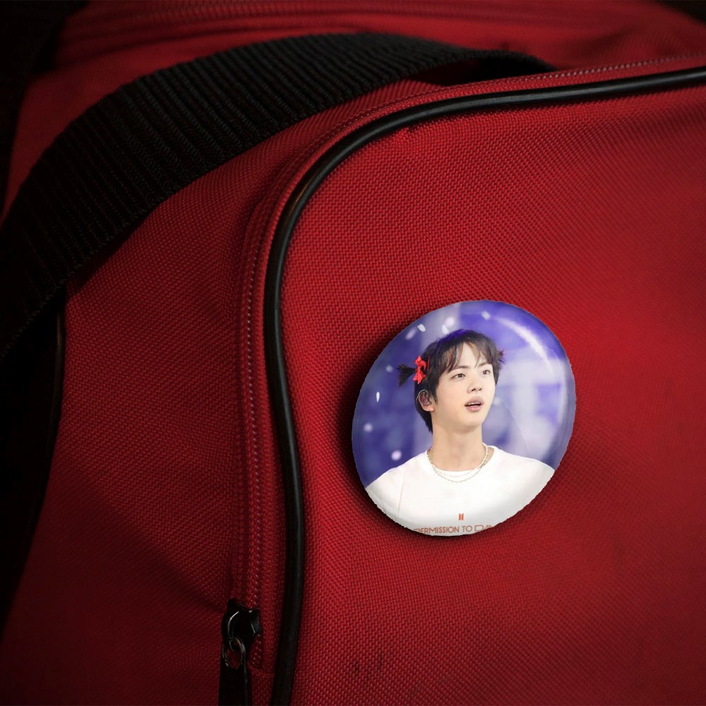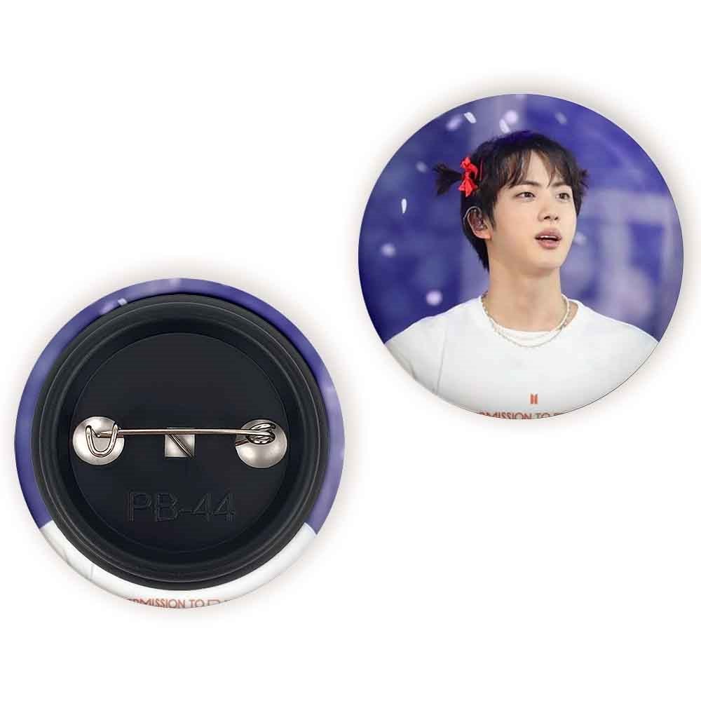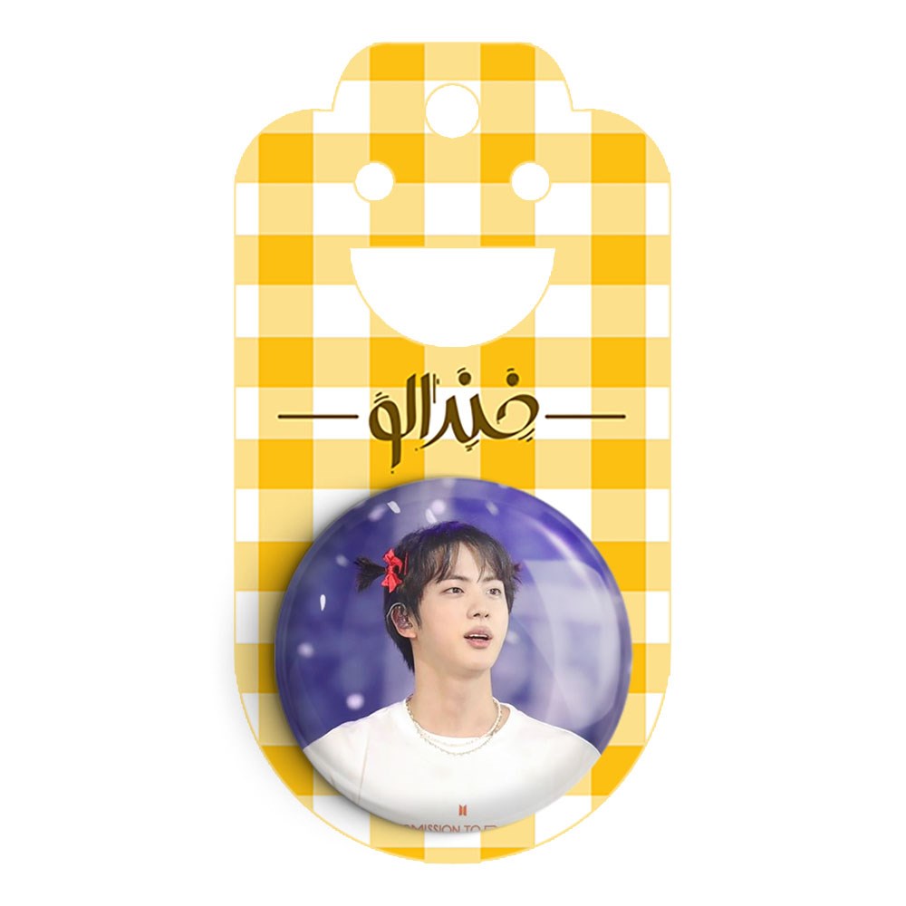 پیکسل 44 میلی متری جین Jin گروه بی تی اس BTS خندالو با روکش سلفون حرارتی مات مخملی ضدخش و قطعه پشتی رنگی تولید شده است.پلاستیکی پشت پیکسل با سوزن یک تکه ثابت و بدون لغزش و جا به جایی، ایستایی بسیار بهتری نسبت به پشتی فلزی پیکسل دارند که این مهم در تولید این محصول نیز رعایت شده است.
