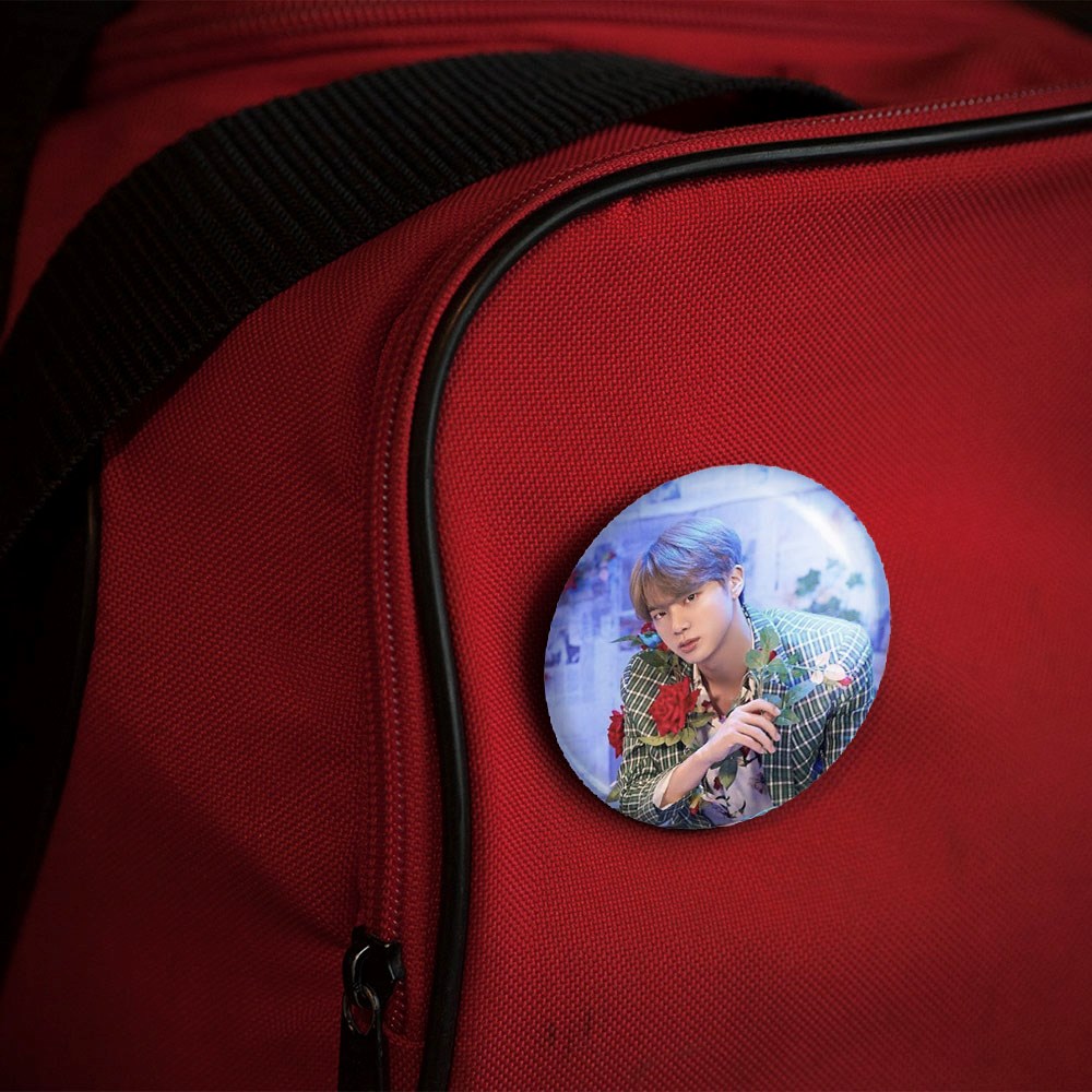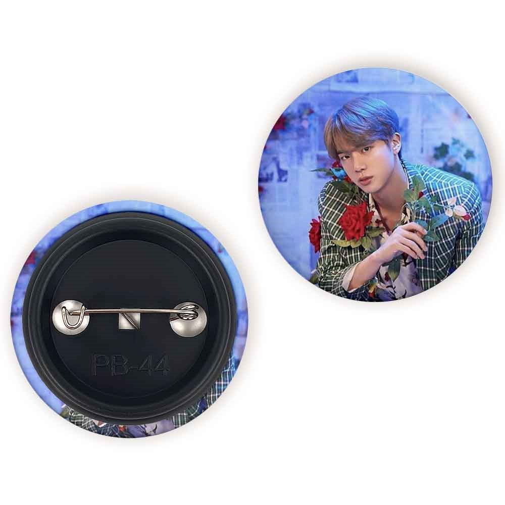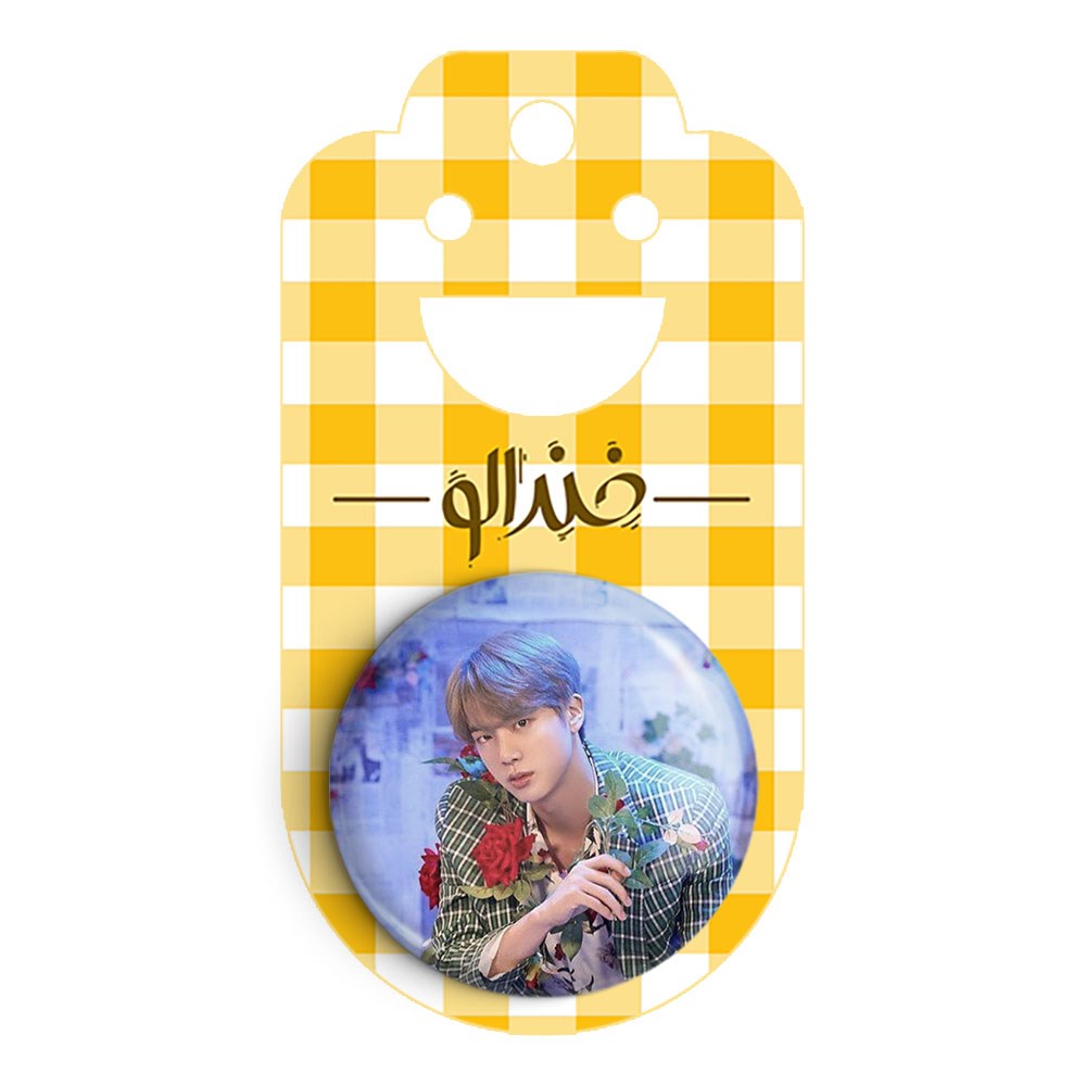 پیکسل 44 میلی متری جین Jin گروه بی تی اس BTS خندالو با روکش سلفون حرارتی مات مخملی ضدخش و قطعه پشتی رنگی تولید شده است.پلاستیکی پشت پیکسل با سوزن یک تکه ثابت و بدون لغزش و جا به جایی، ایستایی بسیار بهتری نسبت به پشتی فلزی پیکسل دارند که این مهم در تولید این محصول نیز رعایت شده است.
