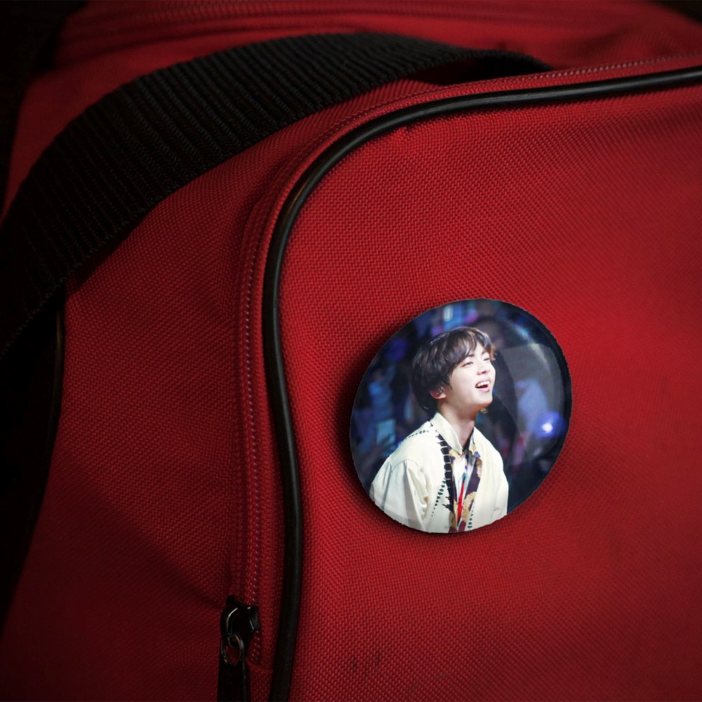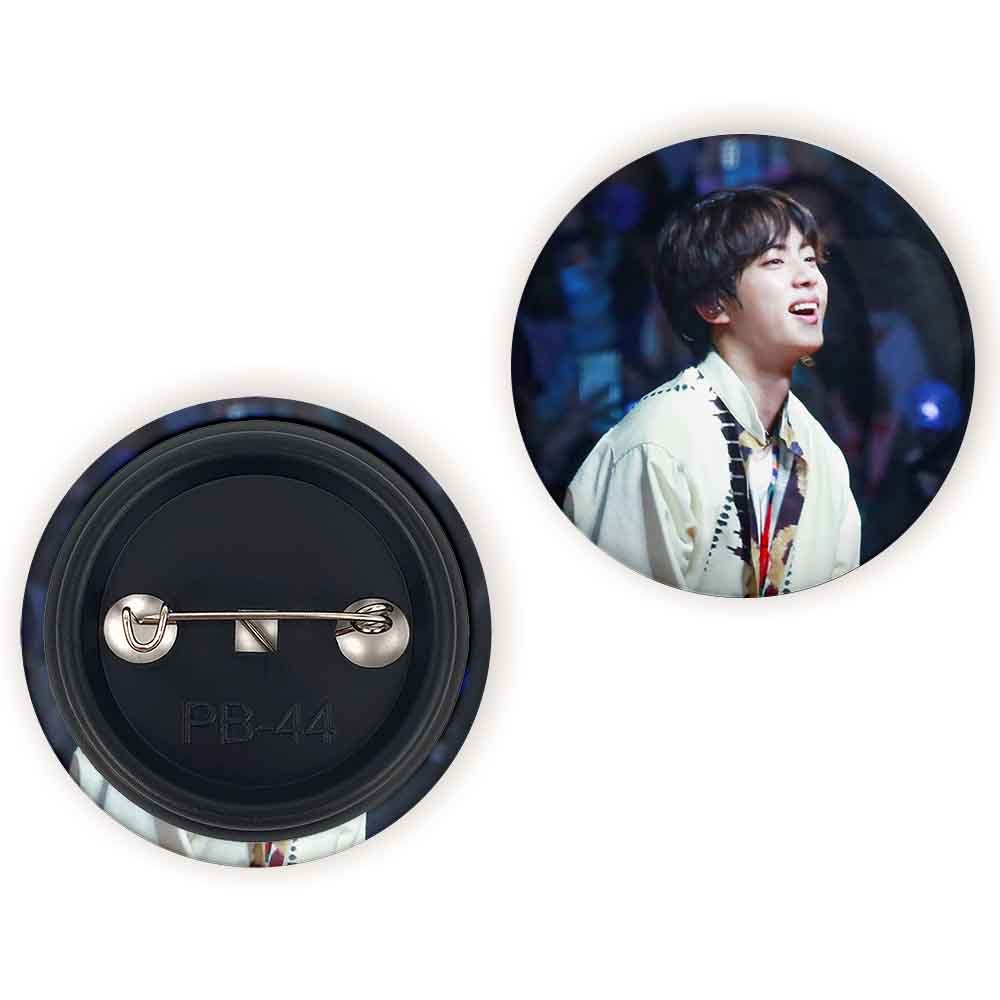 پیکسل 44 میلی متری جین Jin گروه بی تی اس BTS خندالو با روکش سلفون حرارتی مات مخملی ضدخش و قطعه پشتی رنگی تولید شده است.پلاستیکی پشت پیکسل با سوزن یک تکه ثابت و بدون لغزش و جا به جایی، ایستایی بسیار بهتری نسبت به پشتی فلزی پیکسل دارند که این مهم در تولید این محصول نیز رعایت شده است.