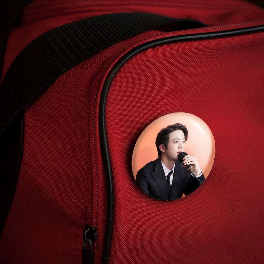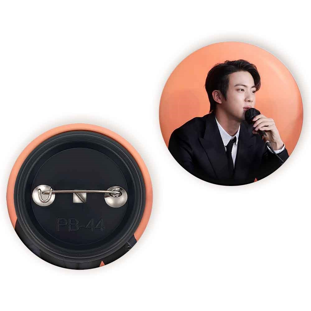 پیکسل 44 میلی متری جین Jin گروه بی تی اس BTS خندالو با روکش سلفون حرارتی مات مخملی ضدخش و قطعه پشتی رنگی تولید شده است.پلاستیکی پشت پیکسل با سوزن یک تکه ثابت و بدون لغزش و جا به جایی، ایستایی بسیار بهتری نسبت به پشتی فلزی پیکسل دارند که این مهم در تولید این محصول نیز رعایت شده است.