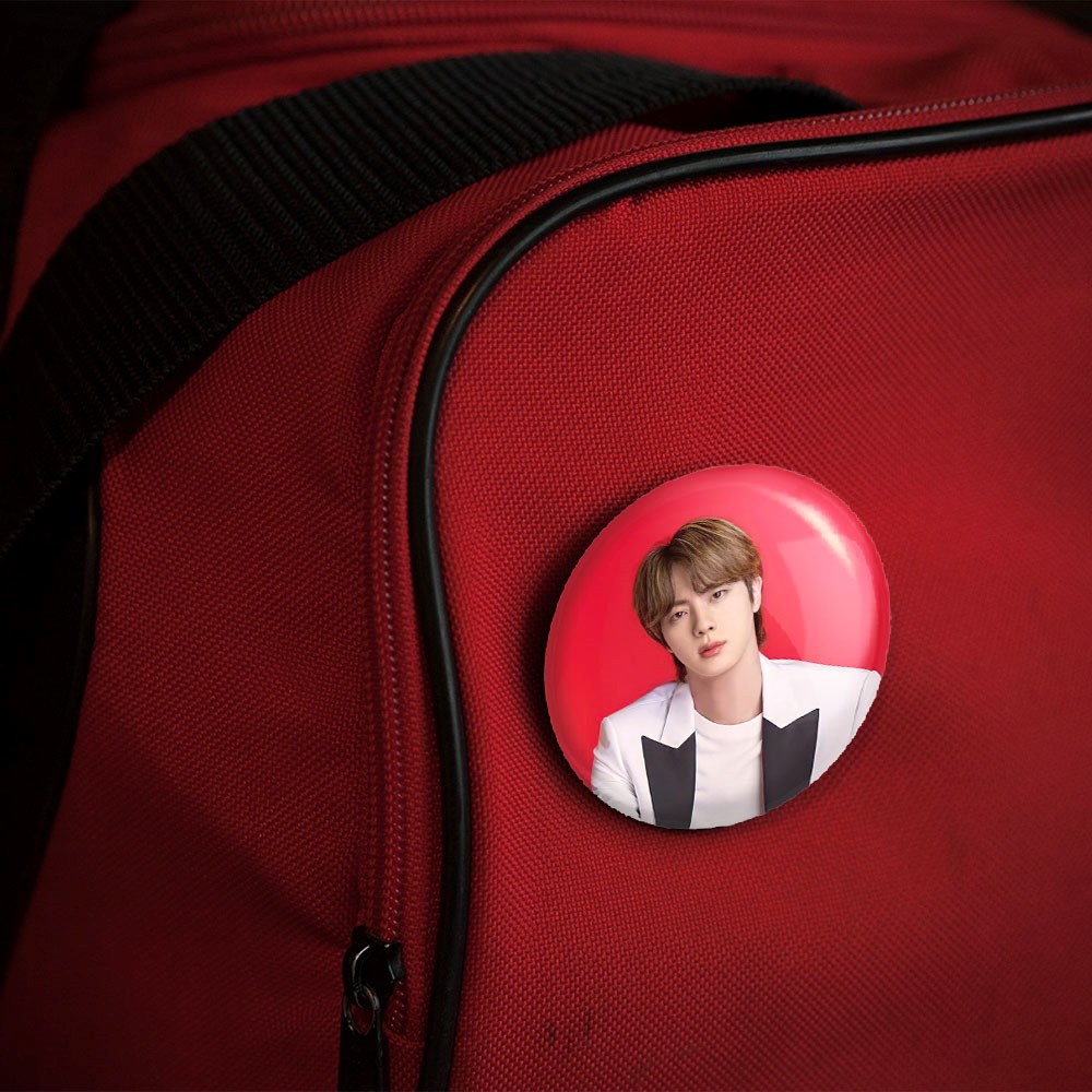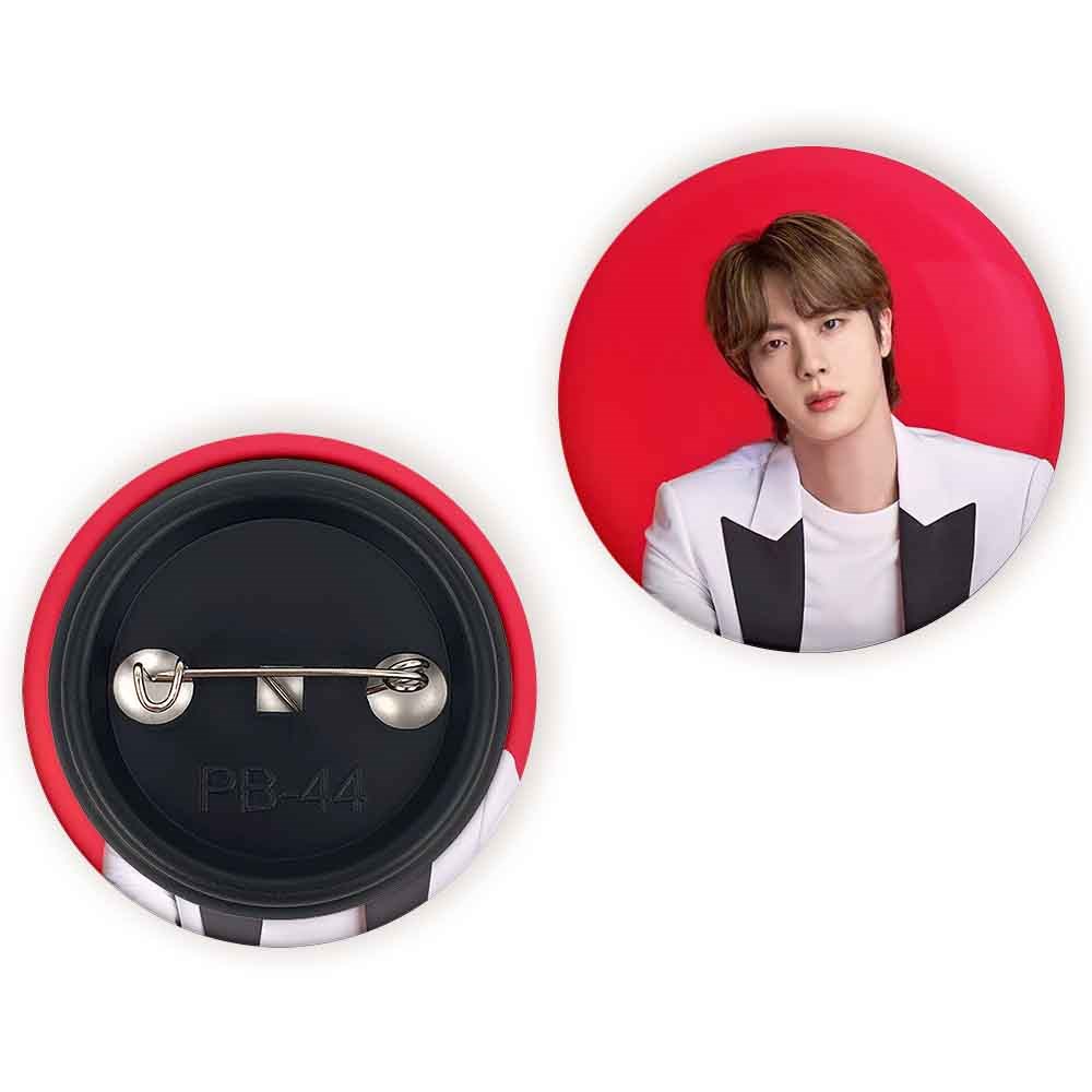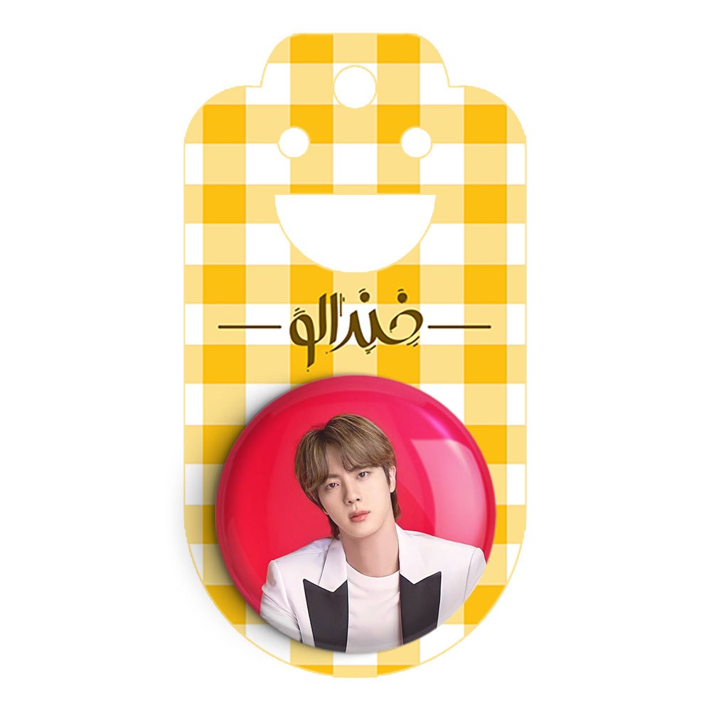 پیکسل 44 میلی متری جین Jin گروه بی تی اس BTS خندالو با روکش سلفون حرارتی مات مخملی ضدخش و قطعه پشتی رنگی تولید شده است.پلاستیکی پشت پیکسل با سوزن یک تکه ثابت و بدون لغزش و جا به جایی، ایستایی بسیار بهتری نسبت به پشتی فلزی پیکسل دارند که این مهم در تولید این محصول نیز رعایت شده است.