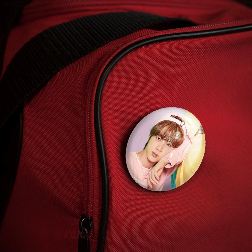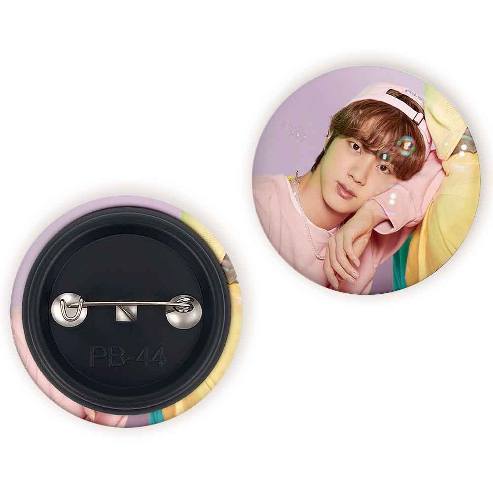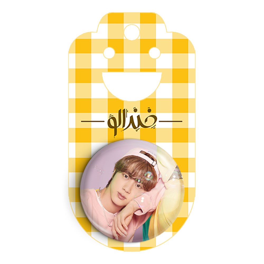 پیکسل 44 میلی متری جین Jin گروه بی تی اس BTS خندالو با روکش سلفون حرارتی مات مخملی ضدخش و قطعه پشتی رنگی تولید شده است.پلاستیکی پشت پیکسل با سوزن یک تکه ثابت و بدون لغزش و جا به جایی، ایستایی بسیار بهتری نسبت به پشتی فلزی پیکسل دارند که این مهم در تولید این محصول نیز رعایت شده است.