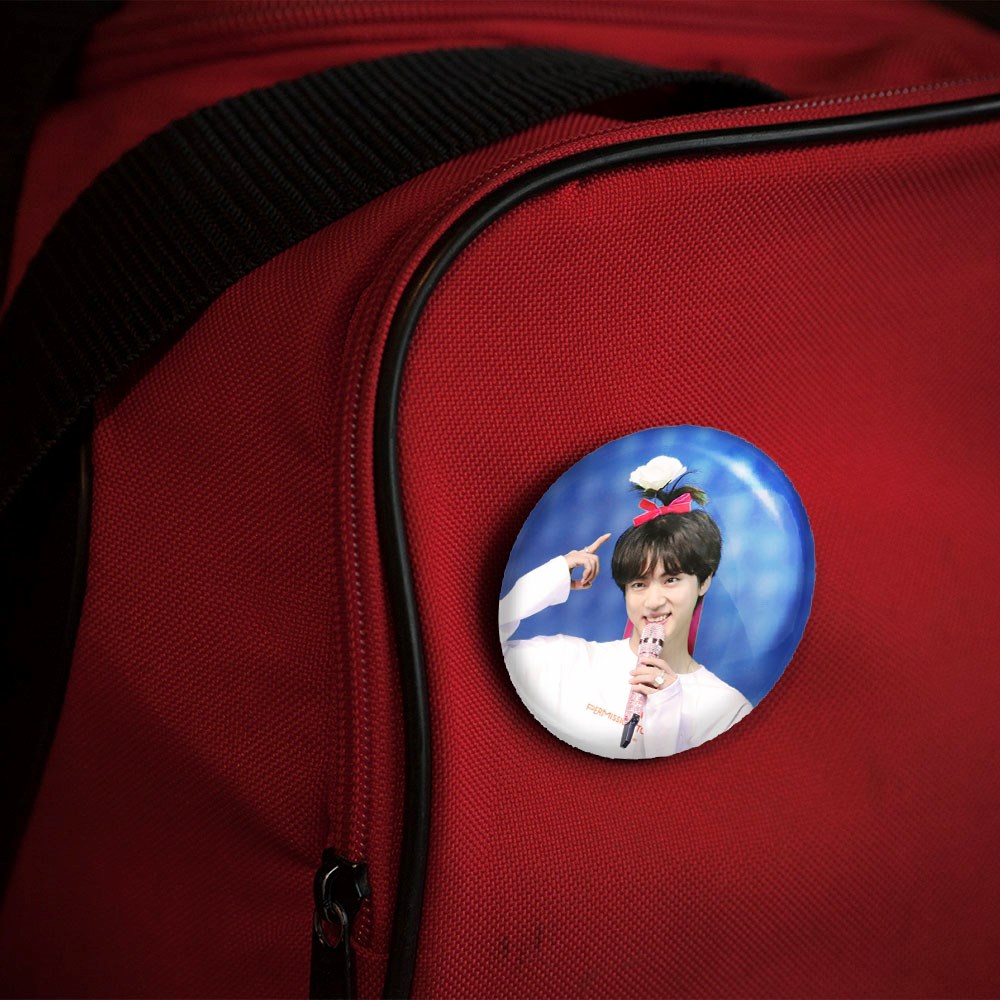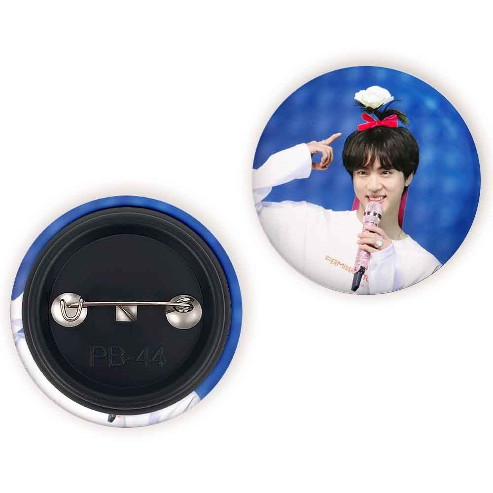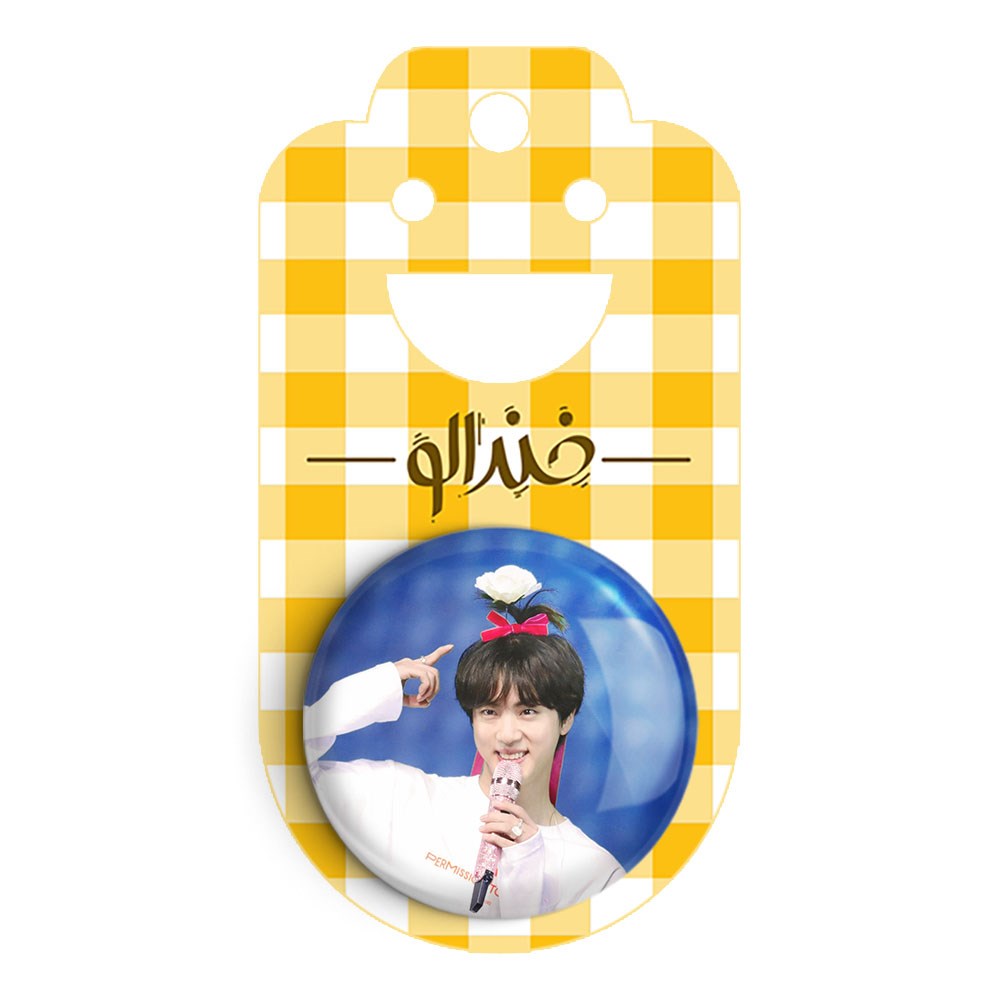 پیکسل 44 میلی متری جین Jin گروه بی تی اس BTS خندالو با روکش سلفون حرارتی مات مخملی ضدخش و قطعه پشتی رنگی تولید شده است.پلاستیکی پشت پیکسل با سوزن یک تکه ثابت و بدون لغزش و جا به جایی، ایستایی بسیار بهتری نسبت به پشتی فلزی پیکسل دارند که این مهم در تولید این محصول نیز رعایت شده است.