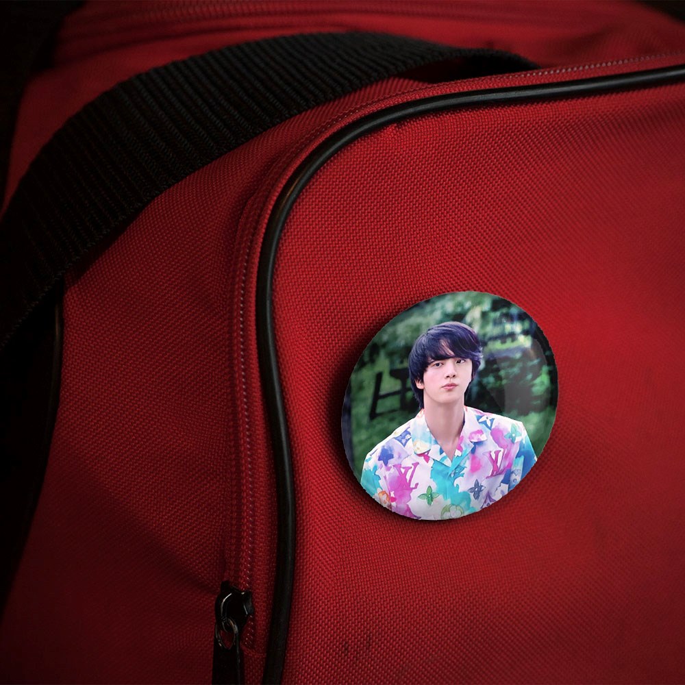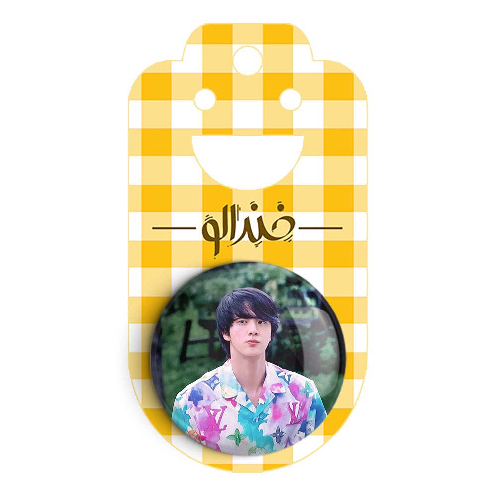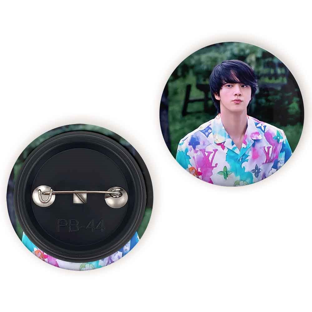 پیکسل 44 میلی متری جین Jin گروه بی تی اس BTS خندالو با روکش سلفون حرارتی مات مخملی ضدخش و قطعه پشتی رنگی تولید شده است.پلاستیکی پشت پیکسل با سوزن یک تکه ثابت و بدون لغزش و جا به جایی، ایستایی بسیار بهتری نسبت به پشتی فلزی پیکسل دارند که این مهم در تولید این محصول نیز رعایت شده است.