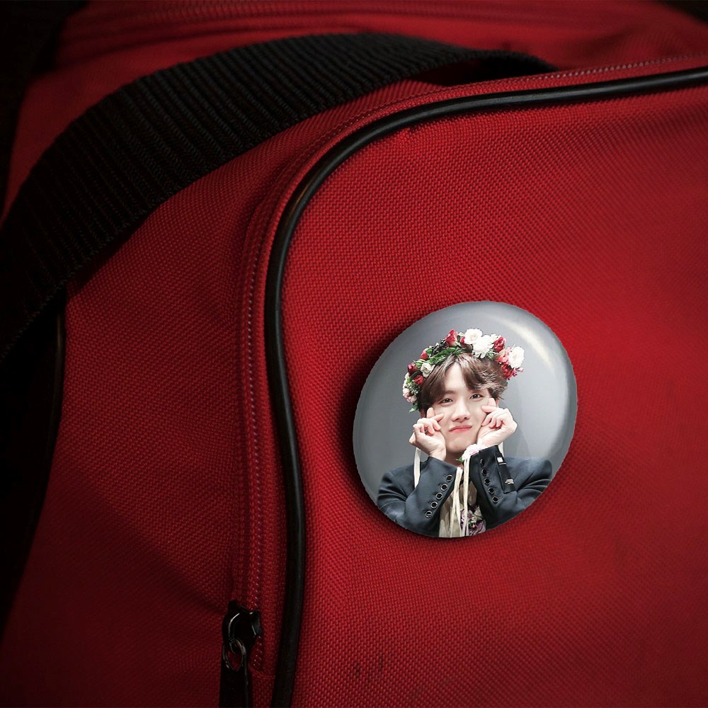 پیکسل 44 میلی متری جی هوپ J Hope گروه بی تی اس BTS خندالو با روکش سلفون حرارتی مات مخملی ضدخش و قطعه پشتی رنگی تولید شده است.پلاستیکی پشت پیکسل با سوزن یک تکه ثابت و بدون لغزش و جا به جایی، ایستایی بسیار بهتری نسبت به پشتی فلزی پیکسل دارند که این مهم در تولید این محصول نیز رعایت شده است.